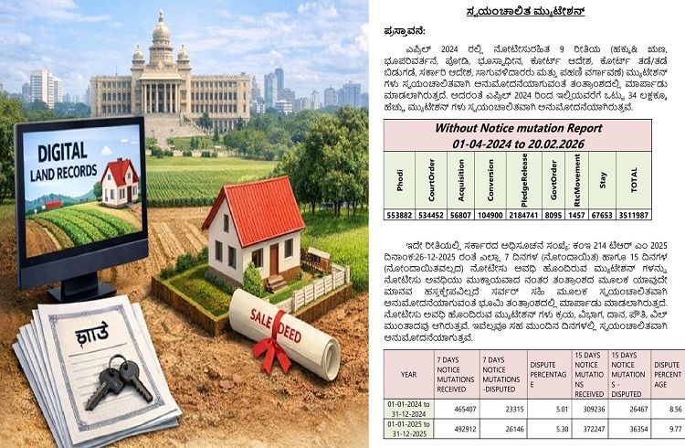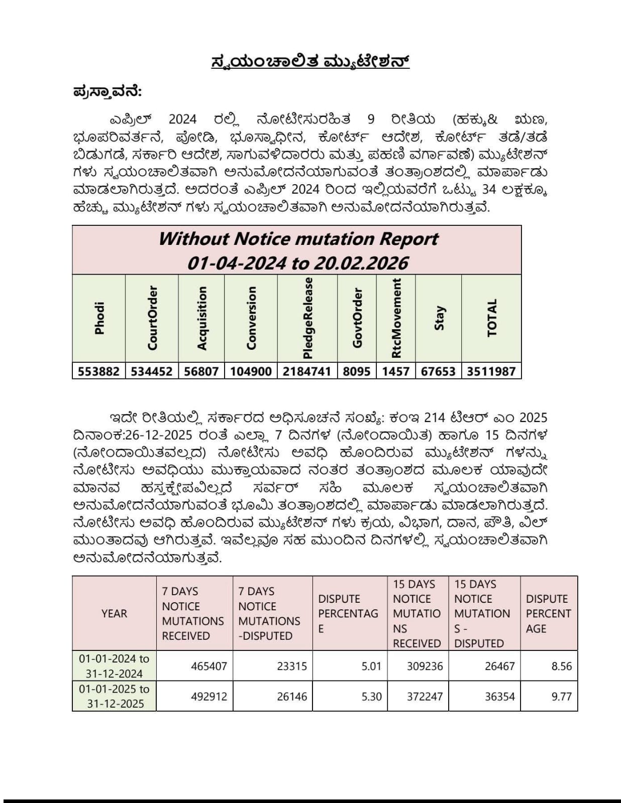 ನೋಟೀಸು ರಹಿತ ಮ್ಯುಟೇಷನ್: ಈಗಾಗಲೇ 2024 ರಿಂದ ಏಪ್ರಿಲ್ನಿಂದ ಕೋರ್ಟ್ ಆದೇಶ, ಭೂಸ್ವಾಧೀನ, ಅಡಮಾನ ಬಿಡುಗಡೆಯಂತಹ 9 ರೀತಿಯ ಪ್ರಕರಣಗಳಲ್ಲಿ ಸುಮಾರು 35 ಲಕ್ಷಕ್ಕೂ ಹೆಚ್ಚು ಮ್ಯುಟೇಷನ್ಗಳನ್ನು ಸ್ವಯಂಚಾಲಿತವಾಗಿ ಮಾಡಲಾಗಿದೆ.