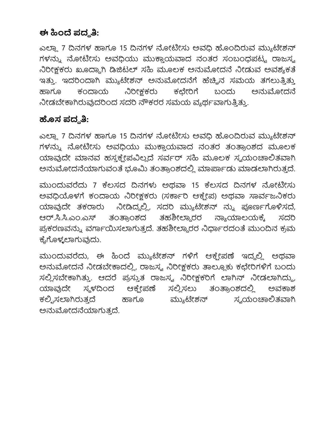 ಮಾನವ ಹಸ್ತಕ್ಷೇಪ ಮುಕ್ತ: ಈ ಹಿಂದೆ ನೋಟೀಸು ಅವಧಿ ಮುಗಿದ ನಂತರ ಕಂದಾಯ ನಿರೀಕ್ಷಕರು (RI) ಡಿಜಿಟಲ್ ಸಹಿ ಮಾಡುವವರೆಗೆ ಕಾಯಬೇಕಿತ್ತು. ಆದರೆ ಹೊಸ ಪದ್ಧತಿಯಲ್ಲಿ ಯಾವುದೇ ಅಧಿಕಾರಿಯ ಹಸ್ತಕ್ಷೇಪವಿಲ್ಲದೆ, ಸಾಫ್ಟ್ವೇರ್ ಮೂಲಕವೇ ಸ್ವಯಂಚಾಲಿತವಾಗಿ ಅನುಮೋದನೆ ದೊರೆಯಲಿದೆ.