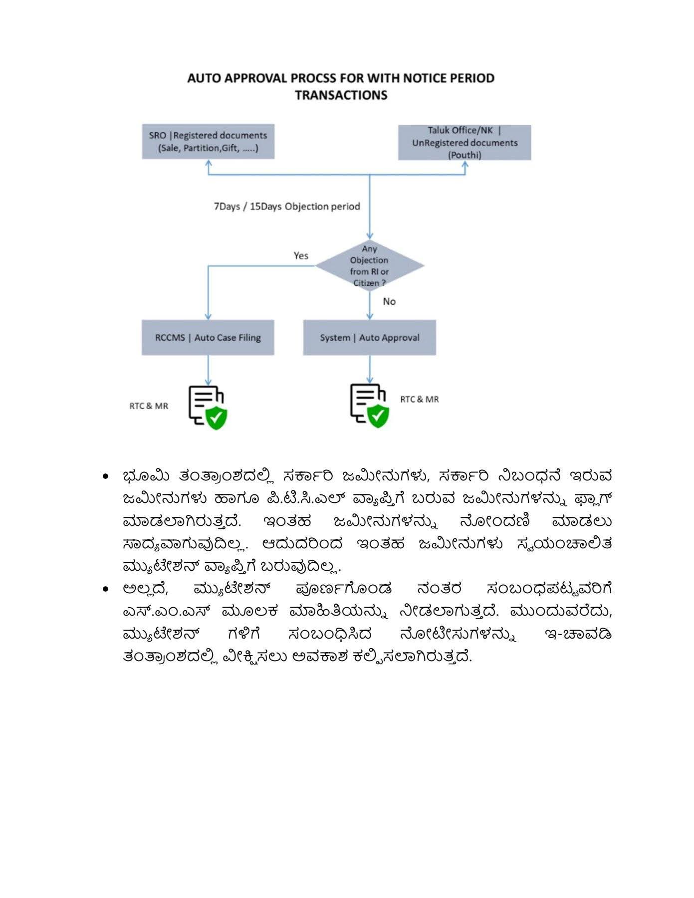 ಗಮನಿಸಿ: ಸರ್ಕಾರಿ ಜಮೀನುಗಳು ಮತ್ತು ಪಿ.ಟಿ.ಸಿ.ಎಲ್ ವ್ಯಾಪ್ತಿಗೆ ಬರುವ ಜಮೀನುಗಳ ದುರ್ಬಳಕೆ ತಡೆಯಲು, ಅಂತಹ ಜಮೀನುಗಳನ್ನು ಸಾಫ್ಟ್ವೇರ್ನಲ್ಲಿ ಲಾಕ್ ಮಾಡಲಾಗಿದ್ದು, ಅವು ಈ ಸ್ವಯಂಚಾಲಿತ ವ್ಯವಸ್ಥೆಯ ವ್ಯಾಪ್ತಿಗೆ ಬರುವುದಿಲ್ಲ.