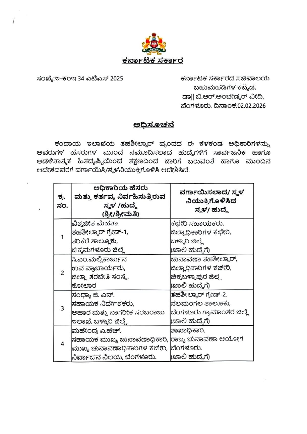 ಈ ಕುರಿತು ಸರ್ಕಾರ ಆದೇಶ ಹೊರಡಿಸಿದ್ದು, ವಿಶ್ವಜೀತ ಮೆಹತಾ ಅವರನ್ನು ಬಳ್ಳಾರಿ ಕಚೇರಿ ಸಹಾಯಕರ ಹುದ್ದೆಗೆ ವರ್ಗಾವಣೆ ಮಾಡಲಾಗಿದೆ. ಬಸವರಾಜ ತನ್ನಹಳ್ಳಿ ಅವರನ್ನು ಕೊಪ್ಪಳ ತಹಶೀಲ್ದಾರ್ ಗ್ರೇಡ್-1 ಆಗಿ ವರ್ಗಾವಣೆಗೊಳಿಸಿದ್ದರೇ, ಪುರಂದರ ಕೆ ಅವರನ್ನು ಸೊರಬ ತಹಶೀಲ್ದಾರ್ ಗ್ರೇಡ್-1 ಆಗಿ ವರ್ಗಾವಣೆ ಮಾಡಲಾಗಿದೆ.