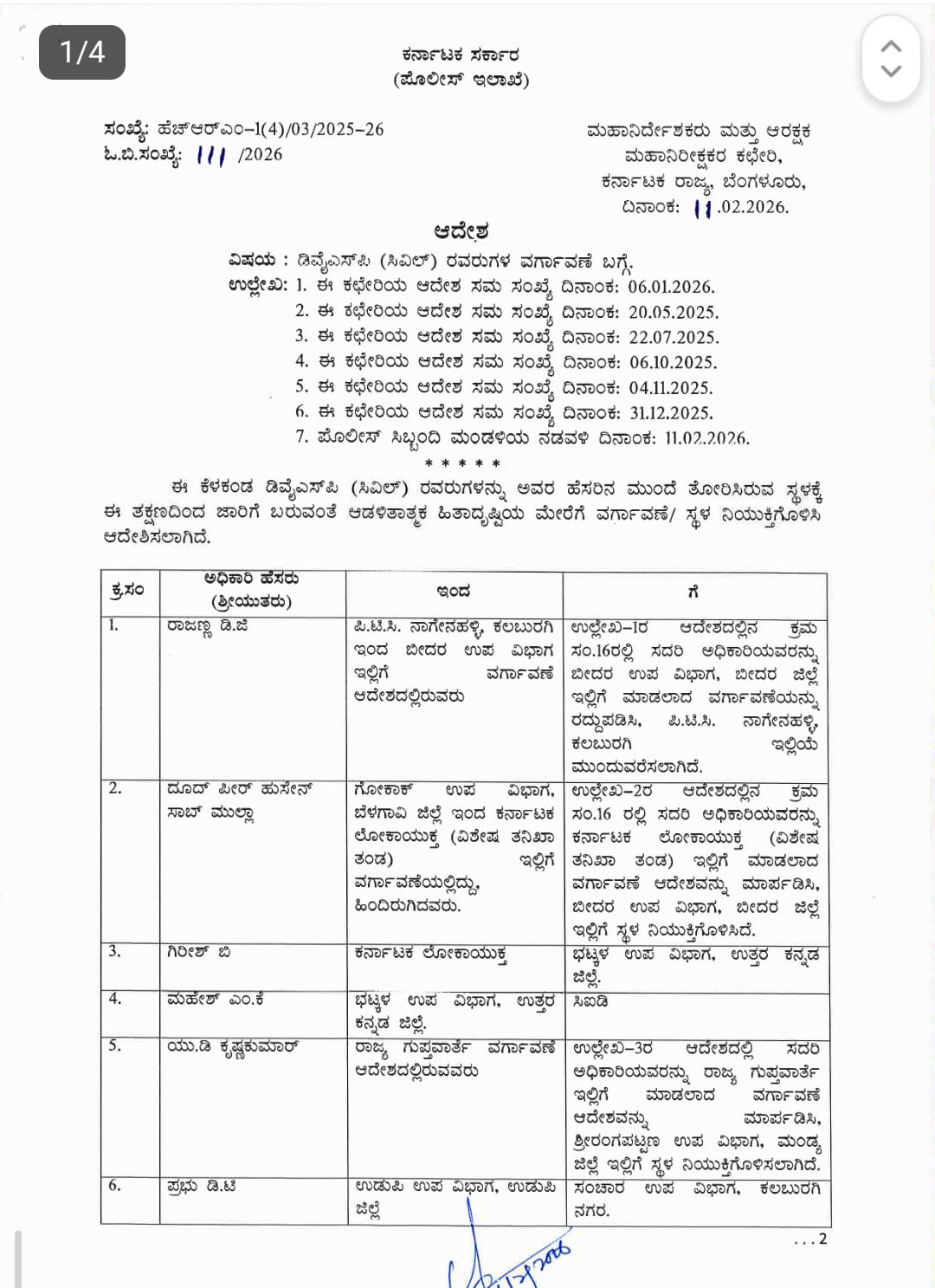 ಇನ್ನೂ ದೂದ್ ಪೀರ್ ಹುಸೇನ್ ಸಾಬ್ ಮುಲ್ಲಾ ಅವರನ್ನು ಗೋಕಾಕ್ ಉಪ ವಿಭಾಗದಿಂದ ಬೀದರ್ ಉಪ ವಿಭಾಗದ ಡಿವೈಎಸ್ಪಿಯಾಗಿ, ಗಿರೀಶ್ ಬಿ ಅವರನ್ನು ಕರ್ನಾಟಕ ಲೋಕಾಯುಕ್ತದಿಂದ ಉತ್ತರ ಕನ್ನಡದ ಭಟ್ಕಳ ಉಪ ವಿಭಾಗದ ಡಿವೈಎಸ್ಪಿಯಾಗಿ ವರ್ಗಾವಣೆ ಮಾಡಲಾಗಿದೆ.