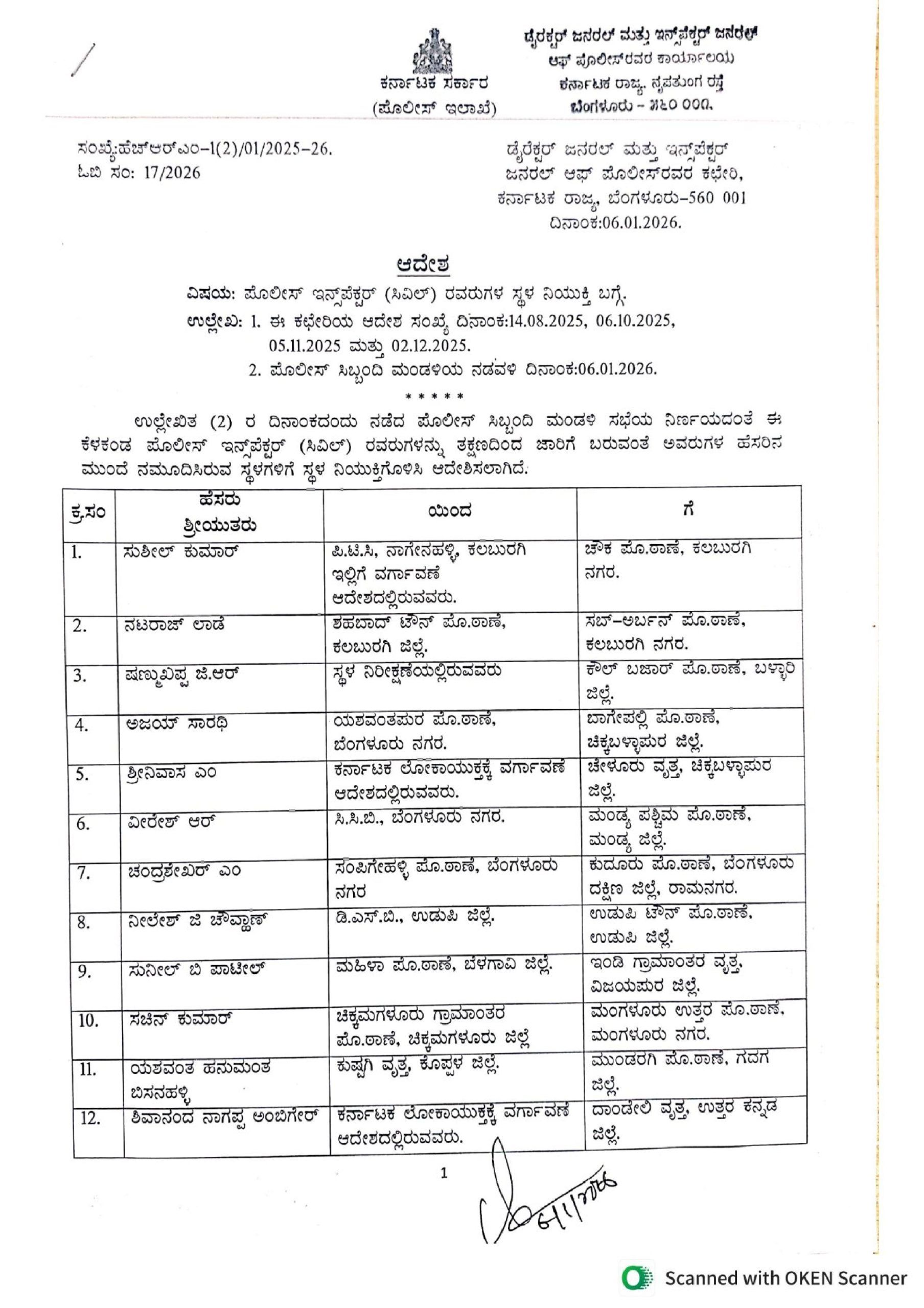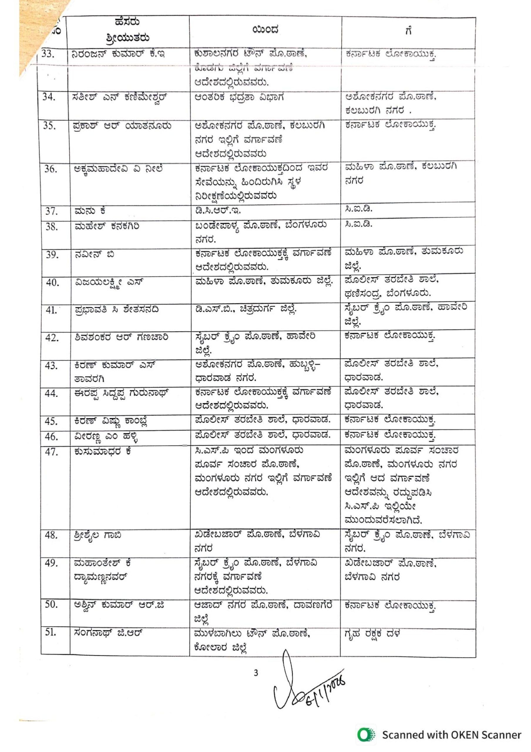 ತುಮಕೂರಿನ ತುರುವೆಕೆರೆ ವೃತ್ತದಿಂದ ಲೋಹಿತ್ ಬಿ.ಎಂ ಅವರನ್ನು ಮಂಗಳೂರಿನ ಕೊಣಾದೆ ಪೊಲೀಸ್ ಠಾಣೆಗೆ, ಕೃಷ್ಣ ಕುಮಾರ್ ಅವರನ್ನು ಕಲಬುರ್ಗಿಯ ಸುಲೆಪೇಟ್ ವೃತ್ತಕ್ಕೆ, ಪುರುಷೋತ್ತಮ್ ಜಿ ಅವರನ್ನು ಚಿತ್ರದುರ್ಗ ಡಿಎಸ್ ಬಿಗೆ ವರ್ಗಾವಣೆ ಮಾಡಲಾಗಿದೆ.