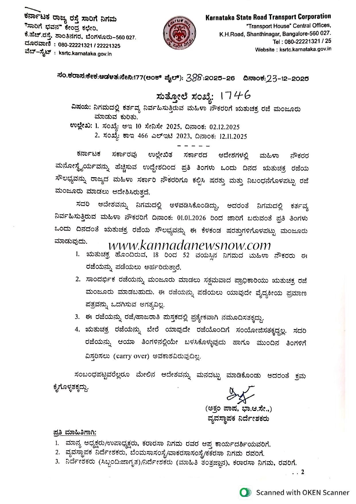 ಸದರಿ ಆದೇಶವನ್ನು ನಿಗಮದಲ್ಲಿ ಅಳವಡಿಸಿಕೊಂಡಿದ್ದು, ಅದರಂತೆ ನಿಗಮದಲ್ಲಿ ಕರ್ತವ್ಯ ನಿರ್ವಹಿಸುತ್ತಿರುವ ಮಹಿಳಾ ನೌಕರರಿಗೆ ದಿನಾಂಕ: 01.01.2026 ರಿಂದ ಜಾರಿಗೆ ಬರುವಂತೆ ಪ್ರತಿ ತಿಂಗಳು ಒಂದು ದಿನದಂತೆ ಋತುಚಕ್ರ ರಜೆಯ ಸೌಲಭ್ಯವನ್ನು ಈ ಕೆಳಕಂಡ ಷರತ್ತುಗಳಿಗೊಳಪಟ್ಟು ಮಂಜೂರು ಮಾಡುವುದು ಎಂದು ಹೇಳಿದ್ದಾರೆ.