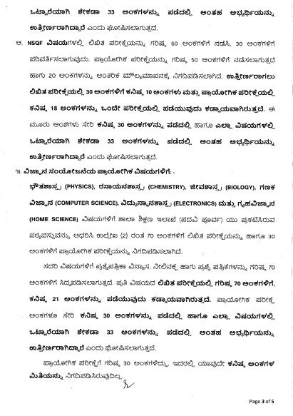 ಆ. NSQF ವಿಷಯಗಳಲ್ಲಿ ಲಿಖಿತ ಪರೀಕ್ಷೆಯನ್ನು ಗರಿಷ್ಠ 60 ಅಂಕಗಳಿಗೆ ನಡೆಸಿ, 30 ಅಂಕಗಳಿಗೆ ಪರಿವರ್ತಿಸಲಾಗುವುದು. ಪ್ರಾಯೋಗಿಕ ಪರೀಕ್ಷೆಯನ್ನು ಗರಿಷ್ಠ 50 ಅಂಕಗಳಿಗೆ ನಡೆಸಲಾಗುತ್ತದೆ ಹಾಗು 20 ಅಂಕಗಳನ್ನು ಆಂತರಿಕ ಮೌಲ್ಯಮಾಪನಕ್ಕೆ ನಿಗದಿಪಡಿಸಲಾಗಿದೆ. ಉತ್ತೀರ್ಣರಾಗಲು ಲಿಖಿತ ಪರೀಕ್ಷೆಯಲ್ಲಿ 30 ಅಂಕಗಳಿಗೆ ಕನಿಷ್ಠ 10 ಅಂಕಗಳು ಮತ್ತು ಪ್ರಾಯೋಗಿಕ ಪರೀಕ್ಷೆಯಲ್ಲಿ ಕನಿಷ್ಠ 18 ಅಂಕಗಳನ್ನು ಒಂದೇ ಪರೀಕ್ಷೆಯಲ್ಲಿ ಪಡೆಯುವುದು ಕಡ್ಡಾಯವಾಗಿರುತ್ತದೆ. ಈ ಮೂರು ಅಂಶಗಳು ಸೇರಿ ಕನಿಷ್ಠ 30 ಅಂಕಗಳನ್ನು ಪಡೆದಲ್ಲಿ ಹಾಗೂ ಎಲ್ಲಾ ವಿಷಯಗಳಲ್ಲಿ ಒಟ್ಟಾರೆಯಾಗಿ ಶೇಕಡಾ 33 ಅಂಕಗಳನ್ನು ಪಡೆದಲ್ಲಿ ಅಂತಹ ಅಭ್ಯರ್ಥಿಯನ್ನು ಉತ್ತೀರ್ಣರಾಗಿದ್ದಾರೆ ಎಂದು ಘೋಷಿಸಲಾಗುತ್ತದೆ.
