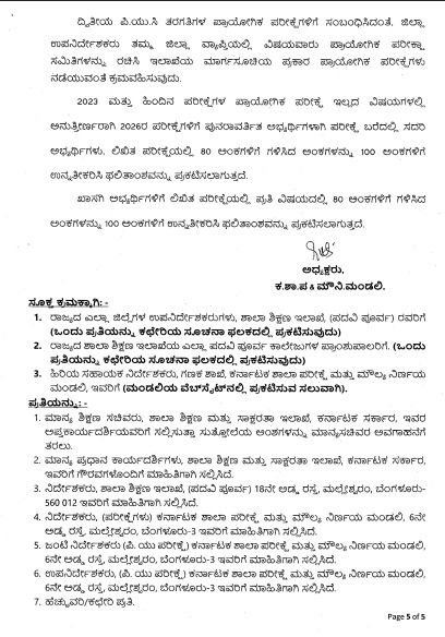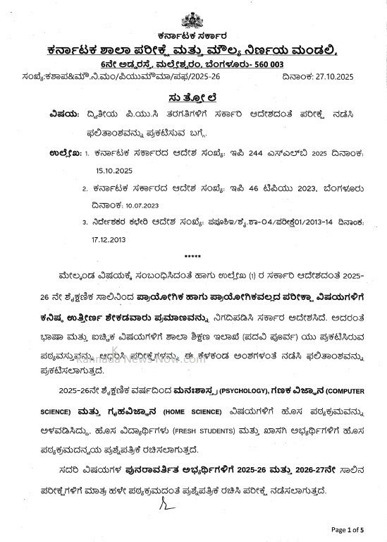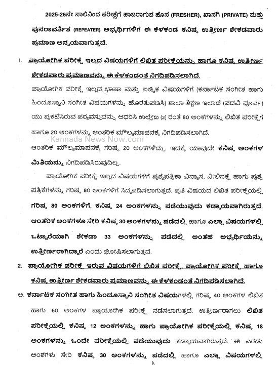 ಮೇಲ್ಕಂಡ ವಿಷಯಕ್ಕೆ ಸಂಬಂಧಿಸಿದಂತೆ ಹಾಗು ಉಲ್ಲೇಖ (1) ರ ಸರ್ಕಾರಿ ಆದೇಶದಂತೆ 2025-26 ನೇ ಶೈಕ್ಷಣಿಕ ಸಾಲಿನಿಂದ ಪ್ರಾಯೋಗಿಕ ಹಾಗು ಪ್ರಾಯೋಗಿಕವಲ್ಲದ ಪರೀಕ್ಷಾ ವಿಷಯಗಳಿಗೆ ಕನಿಷ್ಠ ಉತ್ತೀರ್ಣ ಶೇಕಡವಾರು ಪ್ರಮಾಣವನ್ನು ನಿಗದಿಪಡಿಸಿ ಸರ್ಕಾರ ಅದೇಶಸಿದೆ. ಅದರಂತೆ ಭಾಷಾ ಮತ್ತು ಐಚಿಕ ವಿಷಯಗಳಿಗೆ ಶಾಲಾ ಶಿಕ್ಷಣ ಇಲಾಖೆ (ಪದವಿ ಪೂರ್ವ) ಯು ಪ್ರಕಟಿಸಿರುವ ಪಠ್ಯವಸ್ತುವನ್ನು ಆಧರಿಸಿ ಪರೀಕ್ಷೆಗಳನ್ನು ಈ ಕೆಳಕಂಡ ಅಂಶಗಳಂತೆ ನಡೆಸಿ ಫಲಿತಾಂಶವನ್ನು ಪ್ರಕಟಿಸಲಾಗುತ್ತದೆ.