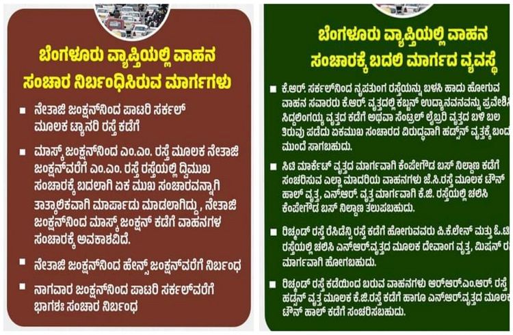 ಬೆಂಗಳೂರು ವ್ಯಾಪ್ತಿಯಲ್ಲಿ ವಾಹನ ಸಂಚಾರ ನಿರ್ಬಂಧಿಸಿರುವ ಮಾರ್ಗಗಳು