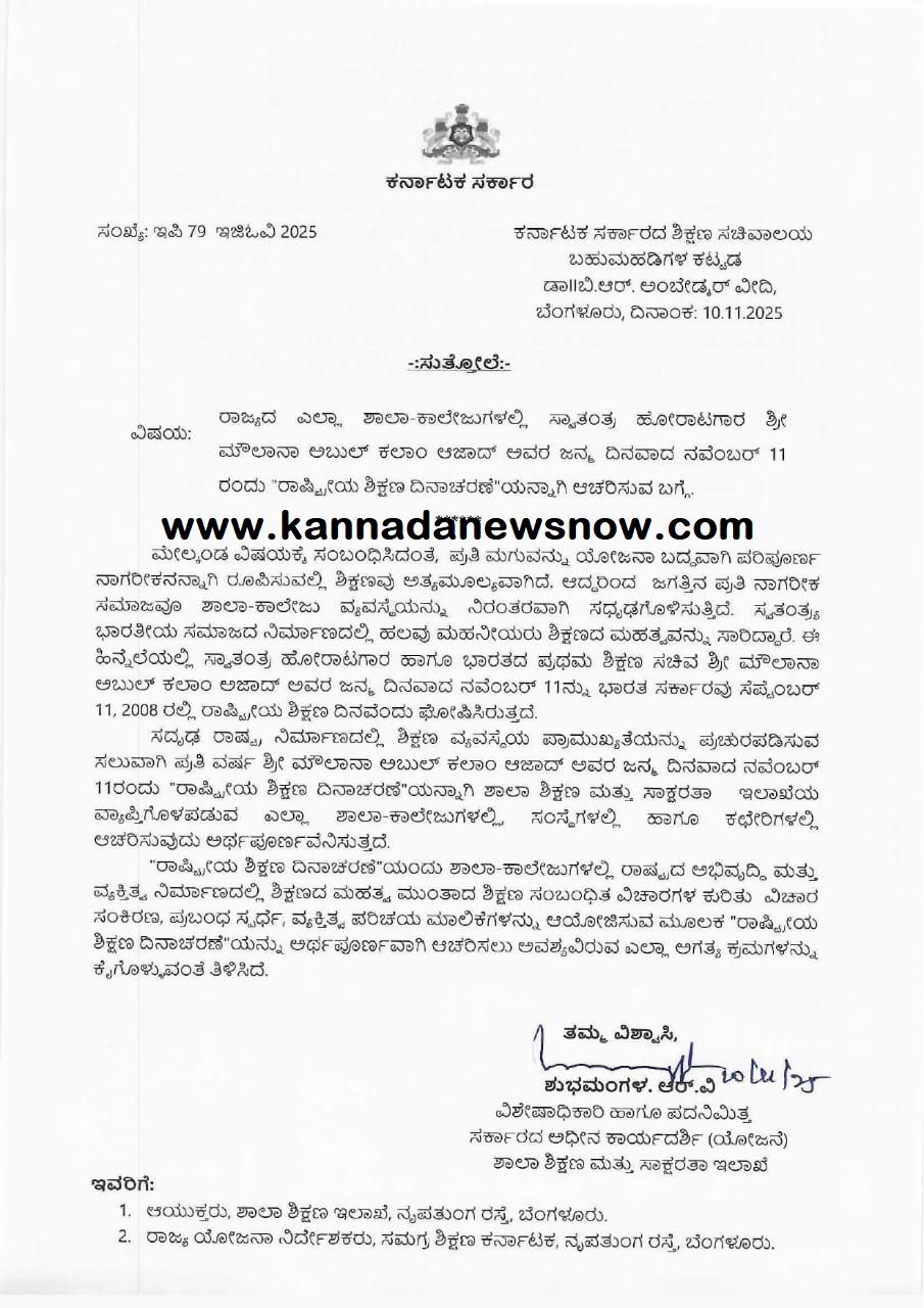 ಸದೃಢ ರಾಷ್ಟ್ರ ನಿರ್ಮಾಣದಲ್ಲಿ ಶಿಕ್ಷಣ ವ್ಯವಸ್ಥೆಯ ಪ್ರಾಮುಖ್ಯತೆಯನ್ನು ಪರವಡಿಸುವ ಸಲುವಾಗಿ ಪ್ರತಿ ವರ್ಷ ಶ್ರೀ ಮೌಲಾನಾ ಅಬುಲ್ ಕಲಾಂ ಆಜಾದ್ ಅವರ ಜನ್ಮ ದಿನವಾದ ನವೆಂಬರ್ 11ರಂದು “ರಾಷಿ, ಯ ಶಿಕ್ಷಣ ದಿನಾಚರಣೆ’ಯನ್ನಾಗಿ ಶಾಲಾ ಶಿಕ್ಷಣ ಮತ್ತು ಸಾಕರ ಇಲಾಖೆಯ ವ್ಯಾಪ್ತಿಗೊಳಪಡುವ ಎಲ್ಲಾ ಶಾಲಾ-ಕಾಲೇಜುಗಳಲ್ಲಿ, ಸಂಸ್ಥೆಗಳಲ್ಲಿ ಹಾಗೂ ಕಛೇರಿಗಳಲ್ಲಿ ಆಚರಿಸುವುದು ಅರ್ಥಪೂರ್ಣವೆನಿಸುತ್ತದೆ ಎಂದು ಹೇಳಿದ್ದಾರೆ.