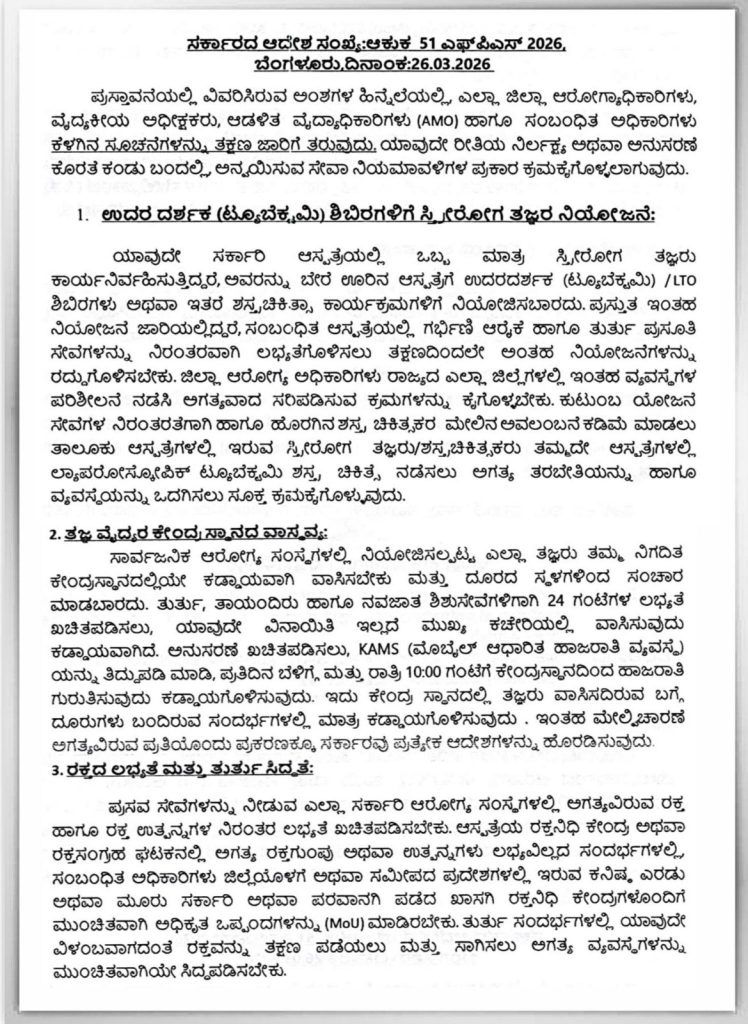 ಯಾವುದೇ ಸರ್ಕಾರಿ ಆಸ್ಪತ್ರೆಯಲ್ಲಿ ಕೇವಲ ಒಬ್ಬರೇ ಸ್ತ್ರೀರೋಗ ತಜ್ಞರಿದ್ದರೆ, ಅವರನ್ನು ಬೇರೆ ಊರಿನ ಶಿಬಿರಗಳಿಗೆ ಅಥವಾ ಶಸ್ತ್ರಚಿಕಿತ್ಸಾ ಕಾರ್ಯಕ್ರಮಗಳಿಗೆ ನಿಯೋಜಿಸುವಂತಿಲ್ಲ. ಒಂದು ವೇಳೆ ಈಗಾಗಲೇ ನಿಯೋಜನೆಗೊಂಡಿದ್ದರೆ, ಗರ್ಭಿಣಿಯರ ತುರ್ತು ಸೇವೆಗೆ ಅಡ್ಡಿಯಾಗದಂತೆ ತಕ್ಷಣವೇ ಅಂತಹ ನಿಯೋಜನೆಯನ್ನು ರದ್ದುಗೊಳಿಸಲು ಸೂಚಿಸಲಾಗಿದೆ.
