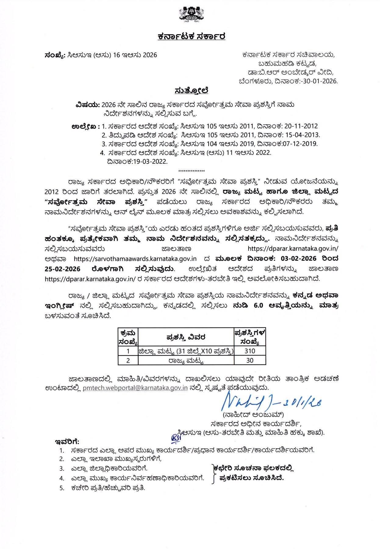 “ಸರ್ವೋತ್ತಮ ಸೇವಾ ಪ್ರಶಸ್ತಿ”ಯ ಎರಡು ಹಂತದ ಪ್ರಶಸ್ತಿಗಳಿಗೂ ಅರ್ಜಿ ಸಲ್ಲಿಸಬಯಸುವವರು, ಪ್ರತಿ ಹಂತಕ್ಕೂ ಪ್ರತ್ಯೇಕವಾಗಿ ತಮ್ಮ ನಾಮ ನಿರ್ದೇಶನವನ್ನು ಸಲ್ಲಿಸತಕ್ಕದ್ದು. ನಾಮನಿರ್ದೇಶನವನ್ನು ಸಲ್ಲಿಸಬಯಸುವವರು ಜಾಲತಾಣ https://dparar.karnataka.gov.in/ ಅಥವಾ https://sarvothamaawards.karnataka.gov.in ದ ಮೂಲಕ ದಿನಾಂಕ: 03-02-2026 ರಿಂದ 25-02-2026 ರೊಳಗಾಗಿ ಸಲ್ಲಿಸುವುದು. ಉಲ್ಲೇಖಿತ ಆದೇಶದ ಪ್ರತಿಗಳನ್ನು ಜಾಲತಾಣ https://dparar.karnataka.gov.in/ ರ ಸರ್ಕಾರದ ಆದೇಶಗಳು-ತರಬೇತಿ ಇಲ್ಲಿ ಅವಲೋಕಿಸಬಹುದಾಗಿದೆ.