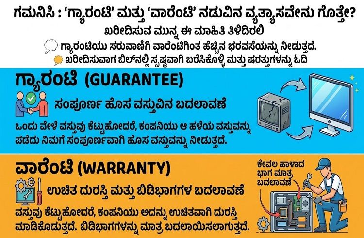 ನಾವು ಯಾವುದೇ ಎಲೆಕ್ಟ್ರಾನಿಕ್ ವಸ್ತು ಅಥವಾ ಗೃಹೋಪಯೋಗಿ ಉಪಕರಣಗಳನ್ನು ಖರೀದಿಸುವಾಗ ಅಂಗಡಿಯವರು ‘ಗ್ಯಾರಂಟಿ’ (Guarantee) ಮತ್ತು ‘ವಾರೆಂಟಿ’ (Warranty) ಎಂಬ ಪದಗಳನ್ನು ಬಳಸುವುದನ್ನು ಕೇಳಿರುತ್ತೇವೆ. ಹೆಚ್ಚಿನ ಗ್ರಾಹಕರು ಇವೆರಡೂ ಒಂದೇ ಎಂದು ಭಾವಿಸುತ್ತಾರೆ. ಆದರೆ ಗ್ರಾಹಕ ಹಕ್ಕುಗಳ ದೃಷ್ಟಿಯಿಂದ ಇವೆರಡರ ನಡುವೆ ದೊಡ್ಡ ವ್ಯತ್ಯಾಸವಿದೆ. ನೀವು ಕಷ್ಟಪಟ್ಟು ಸಂಪಾದಿಸಿದ ಹಣವನ್ನು ಖರ್ಚು ಮಾಡುವಾಗ ಈ ವ್ಯತ್ಯಾಸ ತಿಳಿದಿರುವುದು ಬಹಳ ಮುಖ್ಯ.