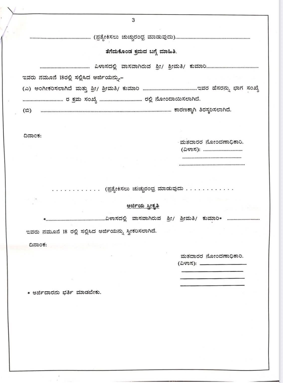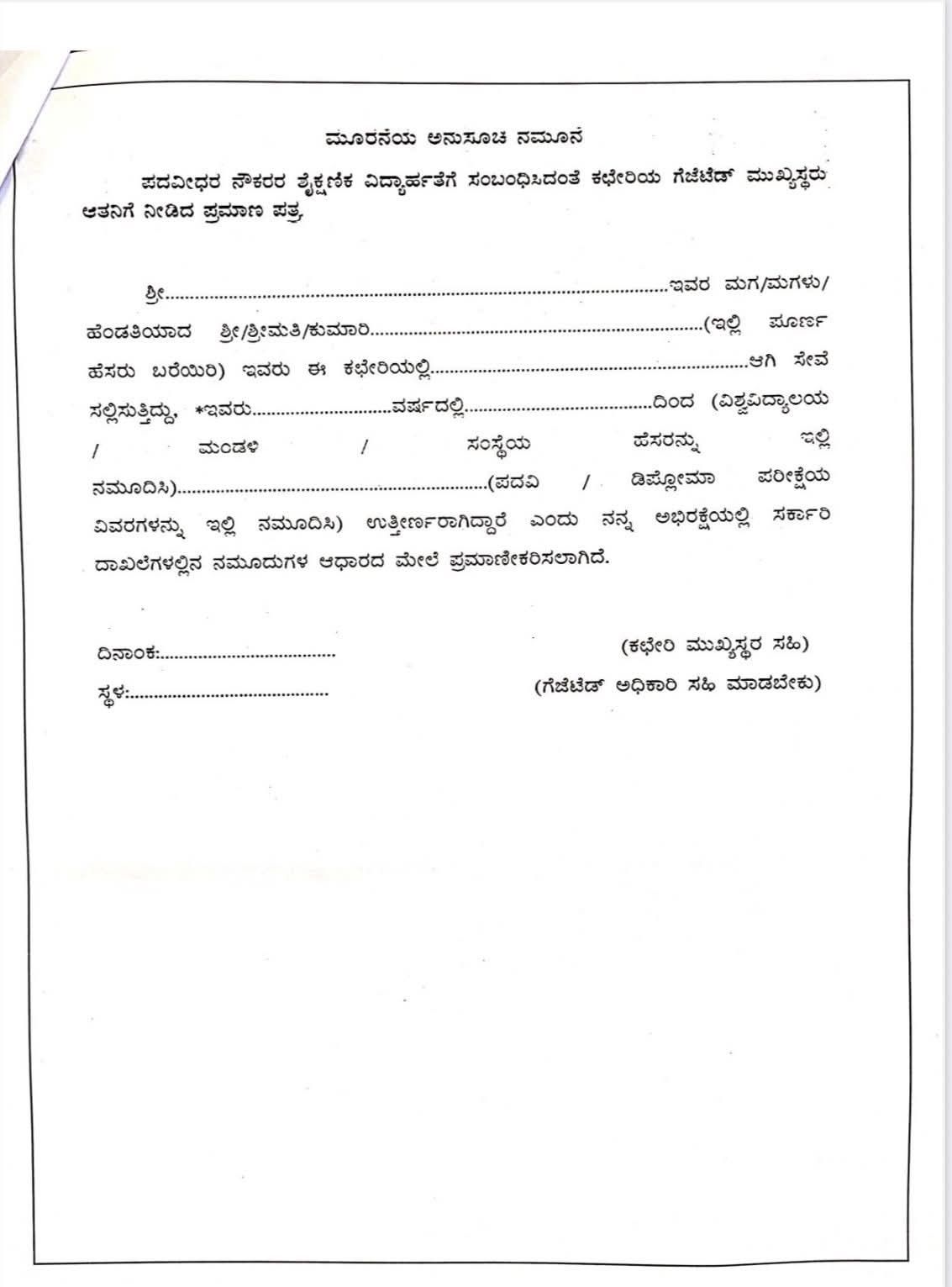 ನಿಗದಿತ ನಮೂನೆಯ ಜೊತೆಗೆ ಗೆಜೆಟೆಡ್ ಅಧಿಕಾರಿಯಂದ ದೃಢೀಕರಿಸಿದ
