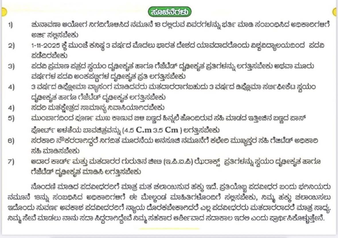 ಪದವಿಧರ ಕ್ಷೇತ್ರದ ಸಾಮಾನ್ಯ ನಿವಾಸಿಯಾಗಿರಬೇಕು. 1 ನವೆಂಬರ್ 2025 ನಿರ್ಧಿಷ್ಟಪಡಿಸಿದ ಅರ್ಹ ದಿನಾಂಕವಾಗಿದ್ದು, ಇದಕ್ಕೂ ಕನಿಷ್ಟ 3 ವರ್ಷಗಳ ಮೊದಲು ರಾಜ್ಯ ಸರ್ಕಾರ ಅಧಿಸೂಚಿಸಿರುವ ವಿಶ್ವ ವಿದ್ಯಾಲಯದಿಂದ ಪದವಿ ಅಥವಾ ಅದಕ್ಕೆ ಸಮಾನವಾದ ವಿದ್ಯಾರ್ಹತೆ ಹೊಂದಿರಬೇಕು.