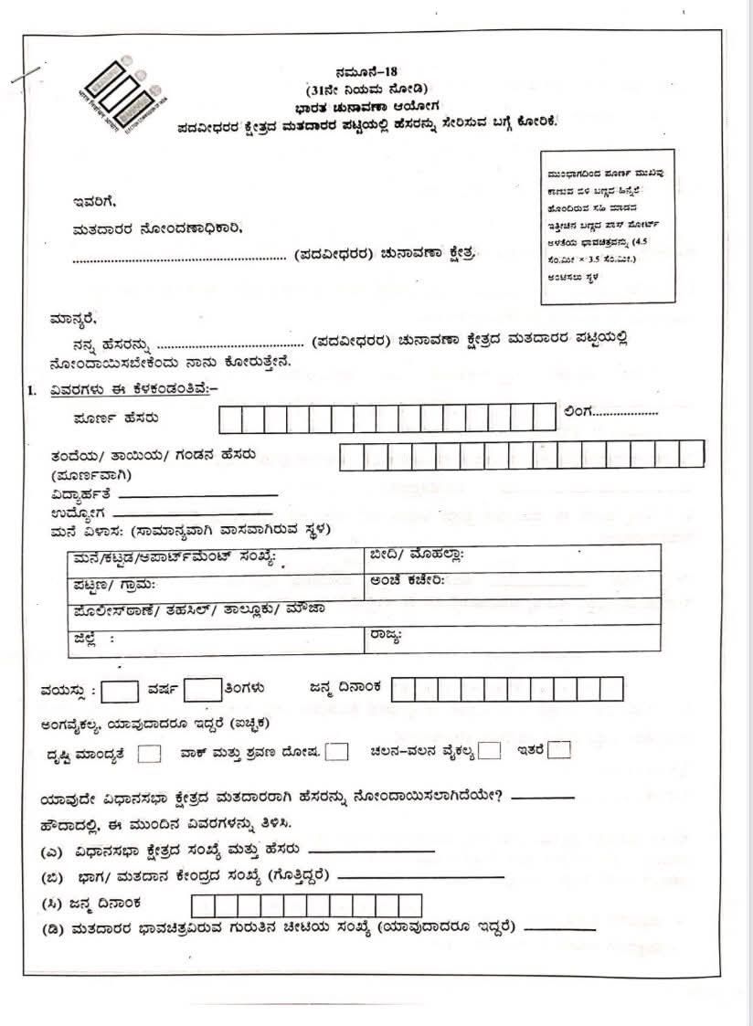 ವಿದ್ಯಾರ್ಹತೆಯ ಪ್ರಮಾಣ ಪತ್ರಗಳೊಂದಿಗೆ ಮತದಾರರ ಗುರುತಿನ ಚೀಟಿ, ಆಧಾರ್ ಕಾರ್ಡ್, ರೇಷನ್ ಕಾರ್ಡ್, ಪಾಸ್ ಪೋರ್ಟ್, ಡ್ರೈವಿಂಗ್ ಲೈಸೆನ್ಸ್, ಬ್ಯಾಂಕ್, ಕಿಸಾನ್ ಅಥವಾ ಅಂಚೆ ಕಚೇರಿ ಚಾಲ್ತಿ ಖಾತೆಯ ಪಾಸ್ ಬುಕ್ ಅಥವಾ ಚುನಾವಣೆ ಆಯೋಗ ನಿಗದಿಪಡಿಸಿದ ಇತರೆ ದಾಖಲೆಗಳನ್ನು ಗೆಜೆಟೆಡ್ ಅಧಿಕಾರಿಗಳಿಂದ ದೃಢೀಕರಿಸಿ ನಮೂನೆ-18 ಅರ್ಜಿಯೊಂದಿಗೆ ವಾಸಸ್ಥಳ ವ್ಯಾಪ್ತಿಯ ಸಹಾಯಕ ಮತದಾರರ ನೋಂದಣಾಧಿಕಾರಿ ಅಥವಾ ನಿರ್ದಿಷ್ಟಪಡಿಸಿದ ಅಧಿಕಾರಿಗಳಿಗೆ ಖುದ್ದಾಗಿ ಅಥವಾ ಅಂಚೆ ಮೂಲಕ ಅರ್ಜಿ ಸಲ್ಲಿಸಬಹುದು. ಅರ್ಜಿ ನಮೂನೆಯನ್ನು ಚುನಾವಣಾ ಆಯೋಗದ ವೆಬ್ಸೈಟ್ http://eci.gov.in/files/category/356-forms-for-registration-in-eroll/ ರಾಜ್ಯ ಚುನಾವಣಾಧಿಕಾರಿಗಳ ಕಚೇರಿ ವೆಬ್ಸೈಟ್https://ceo.karnataka.gov.in/20/download-forms/en ಮೂಲಕ ಡೌನ್ಲೋಡ್ ಮಾಡಿಕೊಳ್ಳಬಹುದು.