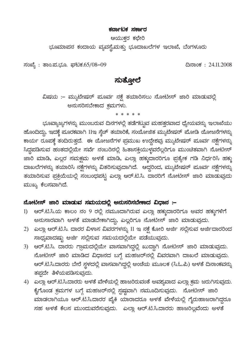 1) ಆರ್ .ಟಿ.ಸಿ.ಯ ಕಾಲಂ ನಂ 9 ರಲ್ಲಿ ನಮೂದಾಗಿರುವ ಎಲ್ಲಾ ಹಕ್ಕುದಾರರಿಗೂ ಅವರ ಹಕ್ಕುಗಳಿಗೆ ಅನುಸಾರವಾಗಿ ಅಳತೆ ಮಾಡಬೇಕಾಗಿದ್ದು, ಎಲ್ಲರಿಗೂ ನೋಟೀಸ್ ಜಾರಿ ಮಾಡುವುದು.