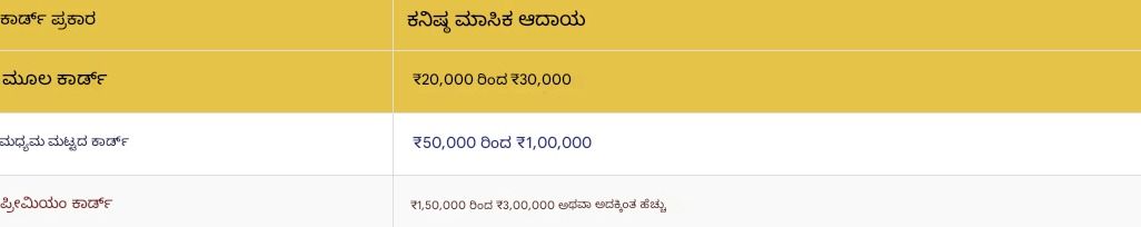 ಕ್ರೆಡಿಟ್ ಕಾರ್ಡ್ಗೆ ಪ್ರತಿ ಬ್ಯಾಂಕ್ ತನ್ನದೇ ಆದ ಮೂಲಭೂತ ಅವಶ್ಯಕತೆಗಳನ್ನು ಹೊಂದಿದೆ. ಸಾಮಾನ್ಯವಾಗಿ, ಅರ್ಜಿದಾರರು 21 ವರ್ಷಕ್ಕಿಂತ ಮೇಲ್ಪಟ್ಟವರಾಗಿರಬೇಕು, ಭಾರತೀಯ ಪ್ರಜೆಯಾಗಿರಬೇಕು ಮತ್ತು ಸ್ಥಿರ ಆದಾಯವನ್ನು ಹೊಂದಿರಬೇಕು. ನಿರ್ದಿಷ್ಟ ಆದಾಯ ಪ್ರಕಾರವನ್ನು ಆಧರಿಸಿ ಯಾವ ಕಾರ್ಡ್ಗಳು ಲಭ್ಯವಿದೆ ಎಂಬುದನ್ನು ಅರ್ಥಮಾಡಿಕೊಳ್ಳಲು ಕೆಳಗಿನ ಕೋಷ್ಟಕವು ನಿಮಗೆ ಸಹಾಯ ಮಾಡುತ್ತದೆ.