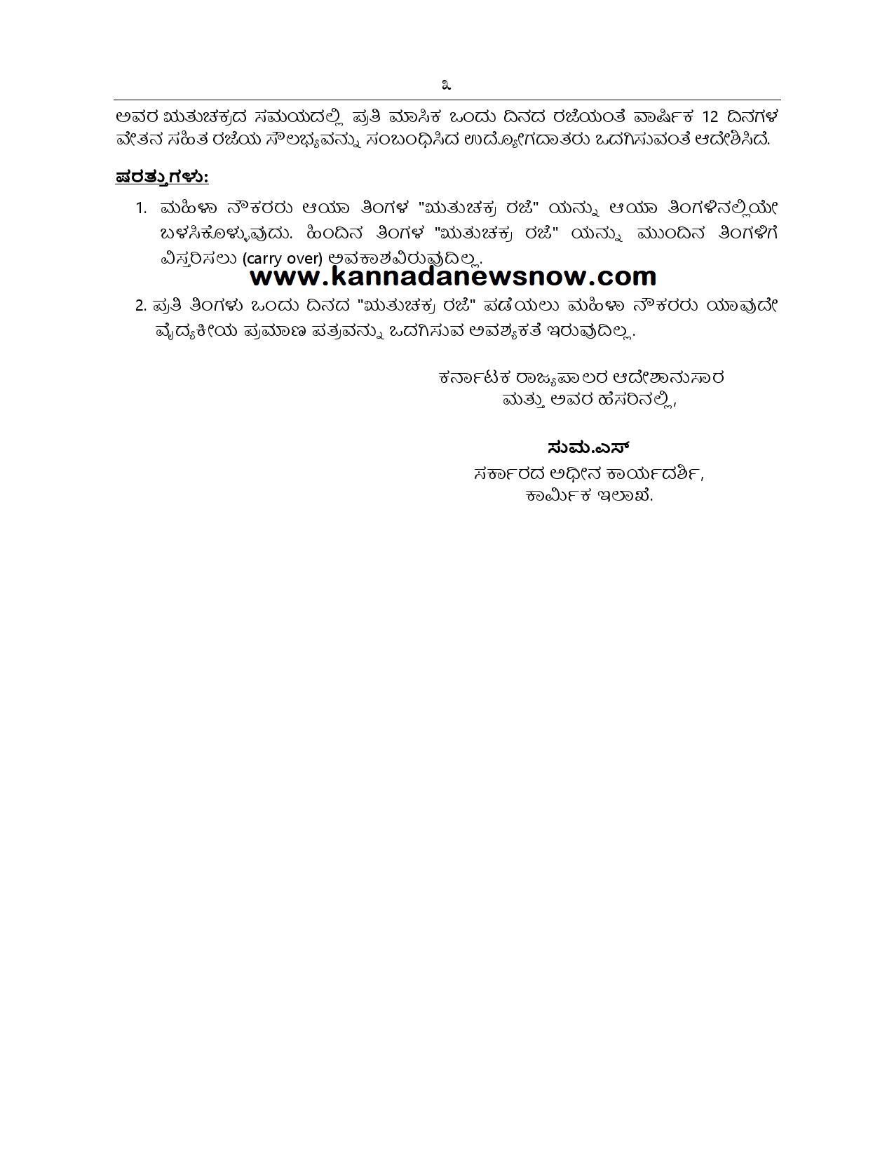 ಪ್ರಸ್ತಾವನೆಯಲ್ಲಿ ವಿವರಿಸಿರುವ ಹಿನ್ನೆಲೆಯಲ್ಲಿ, ರಾಜ್ಯದಲ್ಲಿ ಕಾರ್ಖಾನೆಗಳ ಕಾಯ್ದೆ 1948, ಕರ್ನಾಟಕ ಅಂಗಡಿ ಮತ್ತು ವಾಣಿಜ್ಯ ಸಂಸ್ಥೆಗಳ ಕಾಯ್ದೆ 1961, ತೋಟ ಕಾರ್ಮಿಕರ ಕಾಯ್ದೆ 1951, ಬೀಡಿ ಮತ್ತು ಸಿಗಾರ್ ಕಾರ್ಮಿಕರ (ಉದ್ಯೋಗ ಮತ್ತು ಷರತ್ತುಗಳು) ಕಾಯ್ದೆ, 1966 ಹಾಗೂ ಮೋಟಾರು ಸಾರಿಗೆ ಕಾರ್ಮಿಕರ ಕಾಯ್ದೆ, 1961ರಡಿ ನೋಂದಣಿಯಾಗಿರುವ ಎಲ್ಲಾ ಕೈಗಾರಿಕೆಗಳು ಹಾಗೂ ಸಂಸ್ಥೆಗಳಲ್ಲಿ ಕಾರ್ಯನಿರ್ವಹಿಸುತ್ತಿರುವ 18 ರಿಂದ 52 ವರ್ಷದ ವಯೋಮಿತಿಯ ಎಲ್ಲಾ ಖಾಯಂ/ ಗುತ್ತಿಗೆ/ ಹೊರಗುತ್ತಿಗೆ ಮಹಿಳಾ ನೌಕರರಿಗೆ ಅವರ ಆರೋಗ್ಯ ಕಾರ್ಯದಕ್ಷತೆ ಮತ್ತು ಕಾರ್ಯಕ್ಷಮತೆ ಹೆಚ್ಚಿಸಿ ಅವರ ಮನೋಸ್ಥೆರ್ಯವನ್ನು ಹೆಚ್ಚಿಸುವ ಸದುದ್ದೇಶದಿಂದ, ಅವರ ಋತುಚಕ್ರದ ಸಮಯದಲ್ಲಿ ಪ್ರತಿ ಮಾಸಿಕ ಒಂದು ದಿನದ ರಜೆಯಂತೆ ವಾರ್ಷಿಕ 12 ದಿನಗಳ ವೇತನ ಸಹಿತ ರಜೆಯ ಸೌಲಭ್ಯವನ್ನು ಸಂಬಂಧಿಸಿದ ಉದ್ಯೋಗದಾತರು ಒದಗಿಸುವಂತೆ ಆದೇಶಿಸಿದೆ.