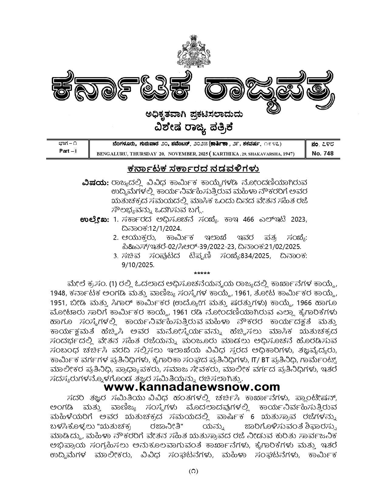 ಈ ಕುರಿತಂತೆ ರಾಜ್ಯ ಸರ್ಕಾರದಿಂದ ವಿಶೇಷ ರಾಜ್ಯಪತ್ರಿಕೆ ಹೊರಡಿಸಲಾಗಿದೆ. ಅದರಲ್ಲಿ ರಾಜ್ಯದಲ್ಲಿ ಕಾರ್ಖಾನೆಗಳ ಕಾಯ್ದೆ, 1948, ಕರ್ನಾಟಕ ಅಂಗಡಿ ಮತ್ತು ವಾಣಿಜ್ಯ ಸಂಸ್ಥೆಗಳ ಕಾಯ್ದೆ, 1961, ತೋಟ ಕಾರ್ಮಿಕರ ಕಾಯ್ದೆ, 1951, ಬೀಡಿ ಮತ್ತು ಸಿಗಾರ್ ಕಾರ್ಮಿಕರ (ಉದ್ಯೋಗ ಮತ್ತು ಷರತ್ತುಗಳು) ಕಾಯ್ದೆ, 1966 ಹಾಗೂ ಮೋಟಾರು ಸಾರಿಗೆ ಕಾರ್ಮಿಕರ ಕಾಯ್ದೆ 1961 ರಡಿ ನೋಂದಣಿಯಾಗಿರುವ ಎಲ್ಲಾ ಕೈಗಾರಿಕೆಗಳು ಹಾಗೂ ಸಂಸ್ಥೆಗಳಲ್ಲಿ ಕಾರ್ಯನಿರ್ವಹಿಸುತ್ತಿರುವ ಮಹಿಳಾ ನೌಕರರ ಕಾರ್ಯದಕ್ಷತೆ ಮತ್ತು ಕಾರ್ಯಕ್ಷಮತೆ ಹೆಚ್ಚಿಸಿ ಅವರ ಮನೋಸ್ಥೆರ್ಯವನ್ನು ಹೆಚ್ಚಿಸಲು ಮಾಸಿಕ ಋತುಚಕ್ರದ ಸಂದರ್ಭದಲ್ಲಿ ವೇತನ ಸಹಿತ ರಜೆಯನ್ನು ಮಂಜೂರು ಮಾಡಲು ಅಧಿಸೂಚನೆ ಹೊರಡಿಸುವ ಸಂಬಂಧ ಚರ್ಚಿಸಿ ವರದಿ ಸಲ್ಲಿಸಲು ಇಲಾಖೆಯ ವಿವಿಧ ಸ್ತರದ ಅಧಿಕಾರಿಗಳು, ತಜ್ಞವೈದ್ಯರು, ಕಾರ್ಮಿಕ ವರ್ಗಗಳ ಪ್ರತಿನಿಧಿಗಳು, ಕೈಗಾರಿಕಾ ಸಂಘದ ಪ್ರತಿನಿಧಿಗಳು, IT/BT ಪ್ರತಿನಿಧಿ, ಗಾರ್ಮೆಂಟ್ಸ್ ಮಾಲೀಕರ ಪ್ರತಿನಿಧಿ, ಪ್ರಾಧ್ಯಾಪಕರು, ಸಮಾಜ ಸೇವಕರು, ಮಾಲೀಕ ವರ್ಗದ ಪ್ರತಿನಿಧಿಗಳು, ಇತರೆ ಸದಸ್ಯರುಗಳನ್ನೊಳಗೊಂಡ ತಜ್ಞರ ಸಮಿತಿಯನ್ನು ರಚಿಸಲಾಗಿತ್ತು ಎಂದಿದೆ.