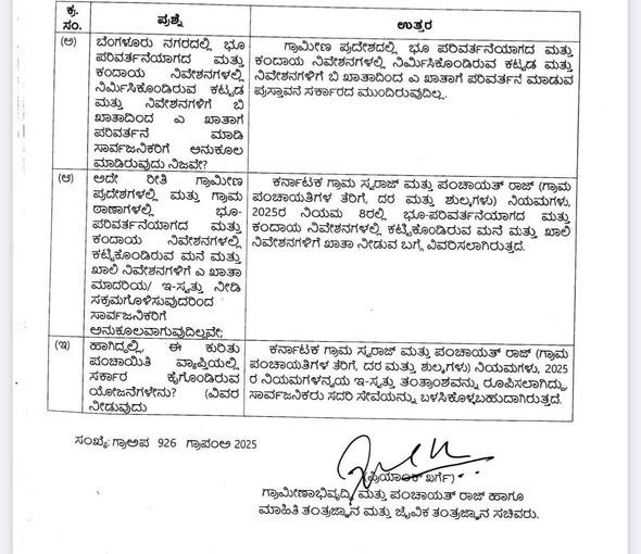 ಗ್ರಾಮೀಣ ಪ್ರದೇಶದಲ್ಲಿ ಭೂ ಪರಿವರ್ತನೆಯಾಗದ ಮತ್ತು ಕಂದಾಯ ನಿವೇಶನಗಳಲ್ಲಿ ನಿರ್ಮಿಸಿಕೊಂಡಿರುವ ಕಟ್ಟಡ ಮತ್ತು ನಿವೇಶನಗಳಿಗೆ ಬಿ ಖಾತಾದಿಂದ ಎ ಖಾತಾಗೆ ಪರಿವರ್ತನೆ ಮಾಡುವ ಪ್ರಸ್ತಾವನೆ ಸರ್ಕಾರದ ಮುಂದಿರುವುದಿಲ್ಲ.