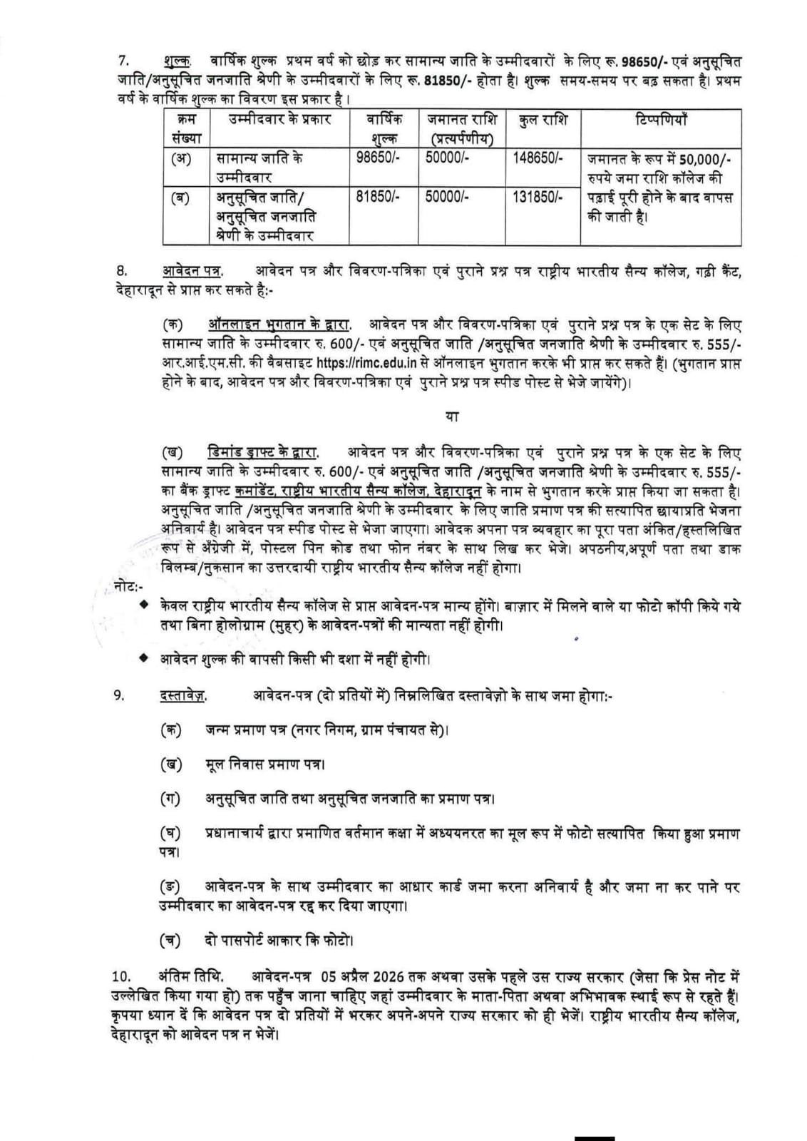 ಜನವರಿ 2027ನೇ ಅಧಿವೇಶನಕ್ಕಾಗಿ ಉತ್ತರಾಖಂಡ ರಾಜ್ಯದ ಡೆಹರಾಡೂನಲ್ಲಿರುವ ರಾಷ್ಟ್ರೀಯ ಇಂಡಿಯನ್ ಮಿಲಿಟರಿ ಕಾಲೇಜ್‌ನಲ್ಲಿ 8ನೇ ತರಗತಿಗಾಗಿ ಪ್ರವೇಶ ಬಯಸುವ ಕರ್ನಾಟಕ ರಾಜ್ಯದ ಬಾಲಕ ಮತ್ತು ಬಾಲಕಿಯರಿಗೆ ಅರ್ಹತಾ ಪ್ರವೇಶ ಪರೀಕ್ಷೆಯನ್ನು ಬೆಂಗಳೂರು ಕೇಂದ್ರದಲ್ಲಿ 2026ರ ಜೂನ್ 07ರ ಭಾನುವಾರ ದಂದು ನಡೆಸಲಾಗುವುದು.