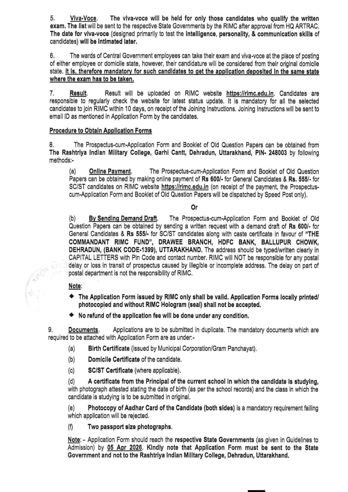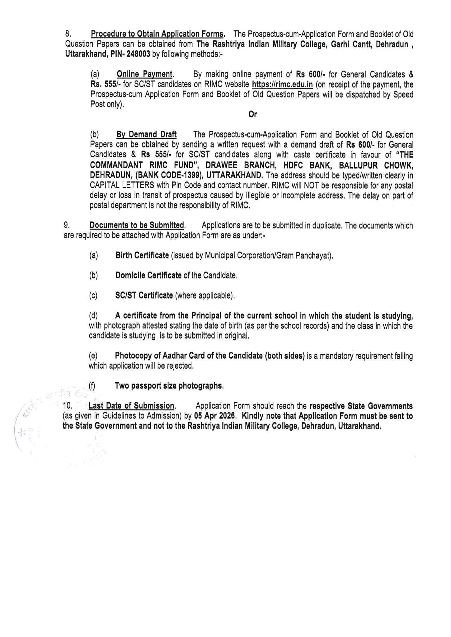 ದಿ ಕಮೆಂಡAಟ್ ರಿಮ್ಕ ಫಂಡ್ ಪೇಬಲ್ ಅಟ್ ಎಚ್‌ಡಿಎಫ್‌ಸಿ ಬ್ಯಾಂಕ್ ಬಳ್ಳಾಪುರ ಚೌಕ್ ಡೆಹ್ರಾಡೂನ್ ಬ್ಯಾಂಕ್ ಕೋಡ್ 1399 ಉತ್ತರಾಖಂಡ ( “THE COMMANDANT RIMC FUND” PAYABLE AT HDFC BANK, BALLUPUR CHOWK,DEHRADUN (BANK CODE. 1399), UTTARAKHAND) ಈ ವಿಳಾಸ, ಪಿನ್ ಕೋಡ್ ಮತ್ತು ಸಂಪರ್ಕ ಸಂಖ್ಯೆಯೊAದಿಗೆ ದೊಡ್ಡ ಅಕ್ಷರಗಳಲ್ಲಿ ಟಯಿಪ್ ಮಾಡಿ ಬರೆಯಬೇಕು. ಕಾನೂನು ಬಾಹಿರ ಅಥವಾ ಅಪೂರ್ಣ ವಿಳಾಸದಿಂದ ಉಂಟಾಗುವ ಪ್ರಾಸ್ಪೆಕ್ಟಸ್‌ನ ಸಾಗಾಣಿಕೆಯಲ್ಲಿ ಯಾವುದೇ ಅಂಚೆ ವಿಳಂಬ ಅಥವಾ ನಷ್ಟಕ್ಕೆ ಆರ್‌ಐಎಮ್‌ಸಿ ಸಂಸ್ಥೆಯು ಜವಾಬ್ದಾರರಾಗಿರುವುದಿಲ್ಲ.