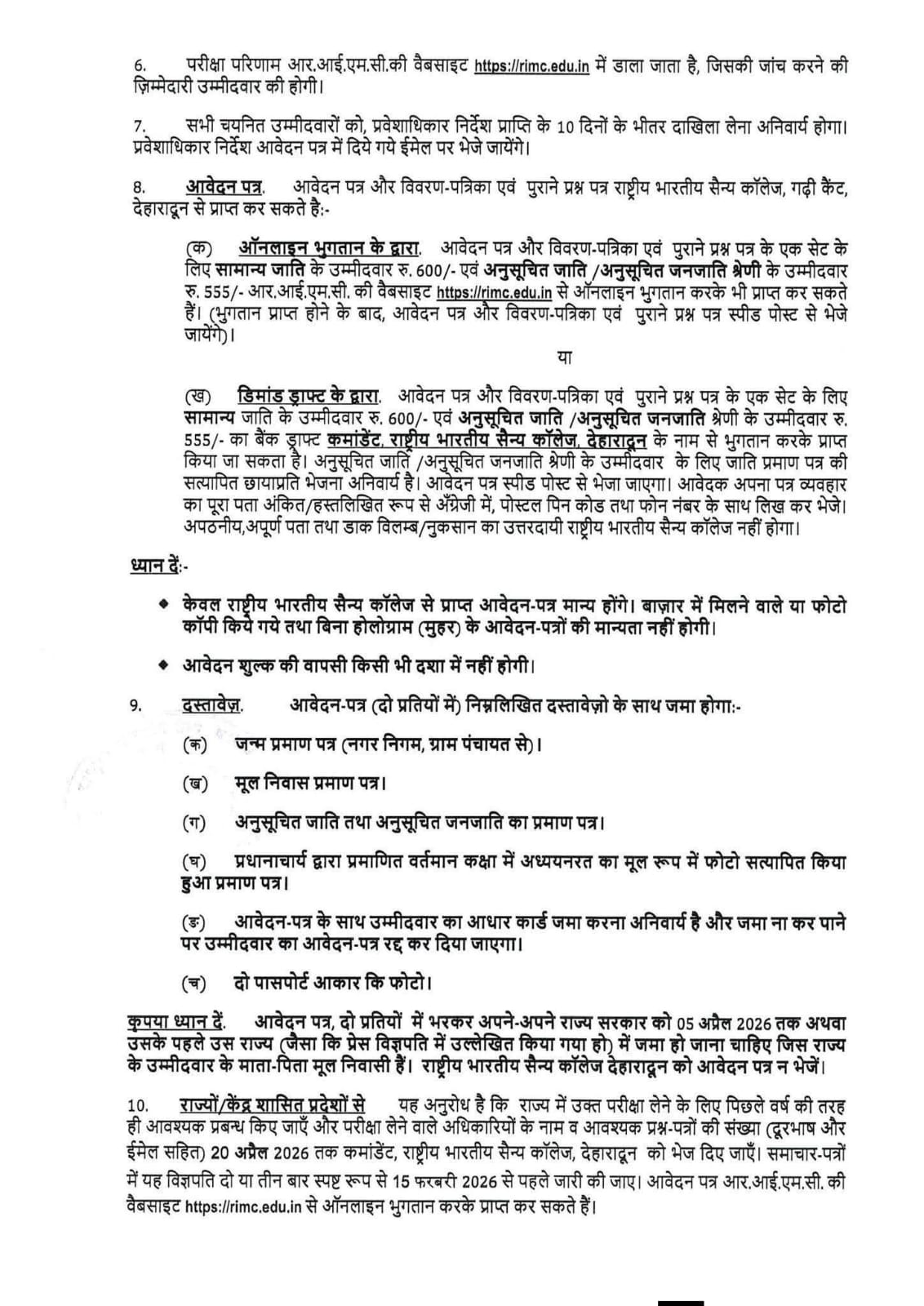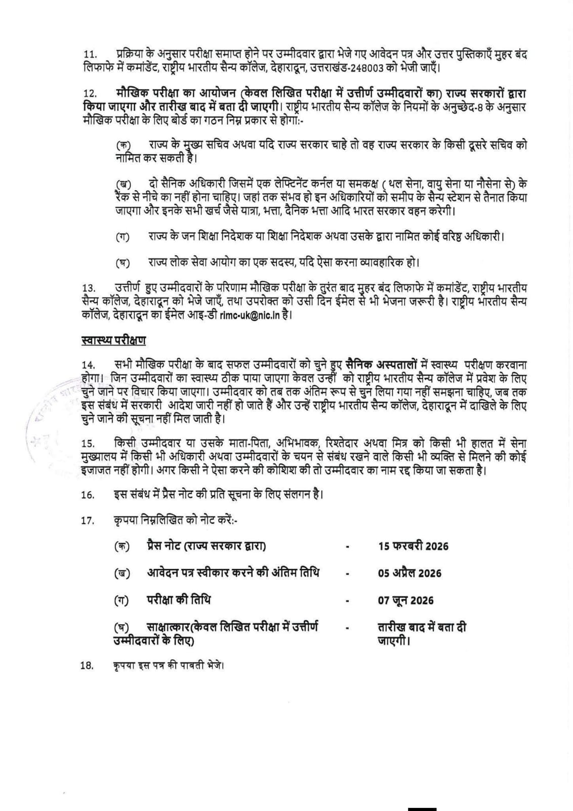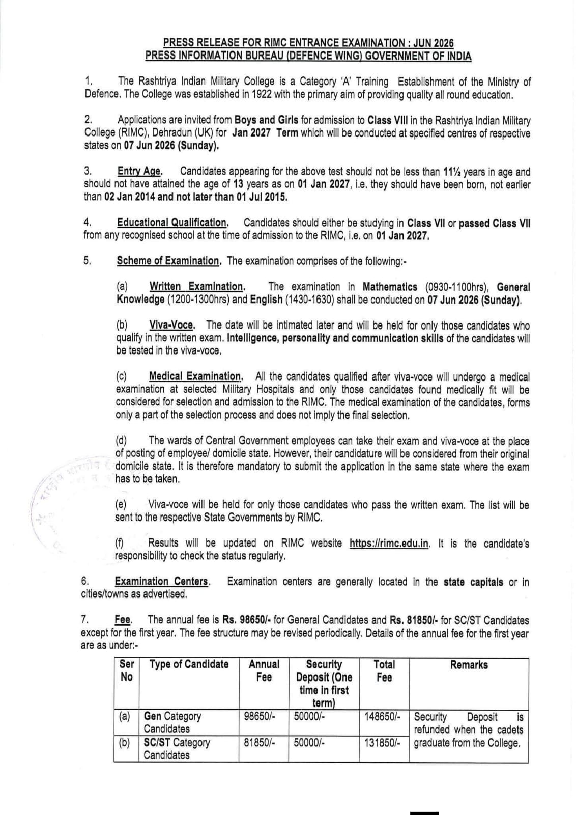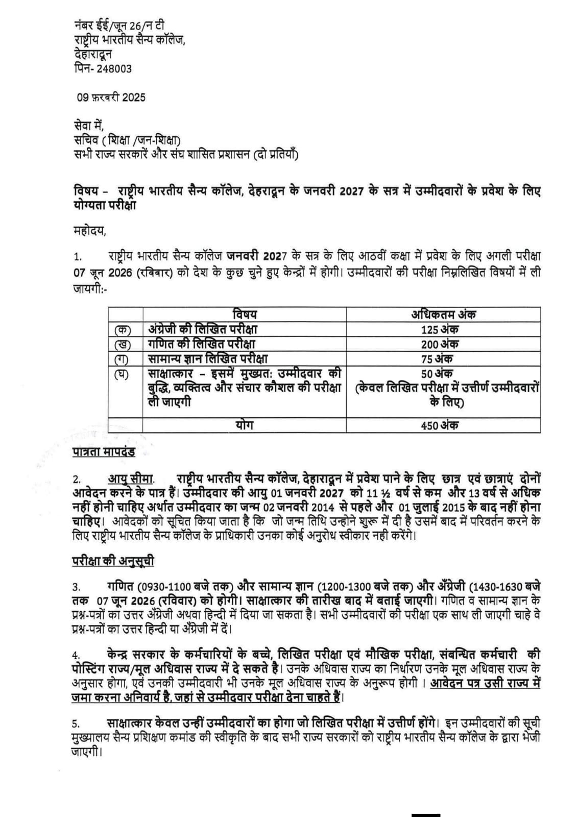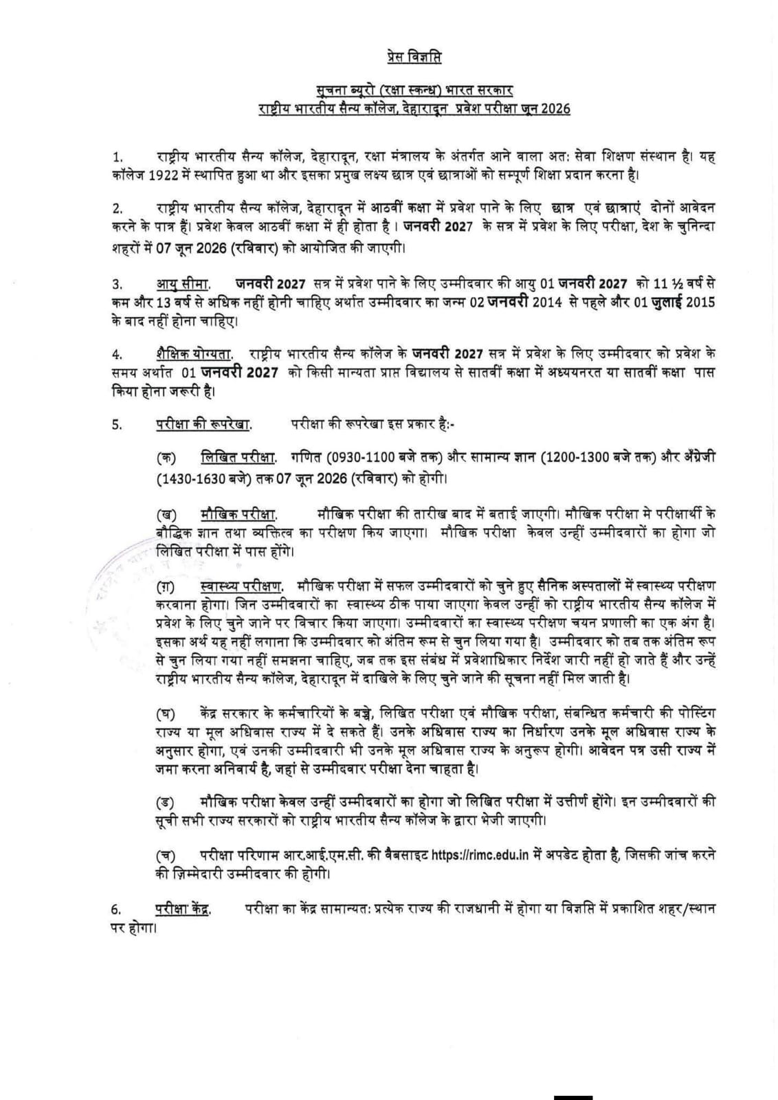 ಜನವರಿ 2027ನೇ ಅಧಿವೇಶನಕ್ಕಾಗಿ ಉತ್ತರಾಖಂಡ ರಾಜ್ಯದ ಡೆಹರಾಡೂನಲ್ಲಿರುವ ರಾಷ್ಟ್ರೀಯ ಇಂಡಿಯನ್ ಮಿಲಿಟರಿ ಕಾಲೇಜ್‌ನಲ್ಲಿ 8ನೇ ತರಗತಿಗಾಗಿ ಪ್ರವೇಶ ಬಯಸುವ ಕರ್ನಾಟಕ ರಾಜ್ಯದ ಬಾಲಕ ಮತ್ತು ಬಾಲಕಿಯರಿಗೆ ಅರ್ಹತಾ ಪ್ರವೇಶ ಪರೀಕ್ಷೆಯನ್ನು ಬೆಂಗಳೂರು ಕೇಂದ್ರದಲ್ಲಿ 2026ರ ಜೂನ್ 07ರ ಭಾನುವಾರ ದಂದು ನಡೆಸಲಾಗುವುದು.