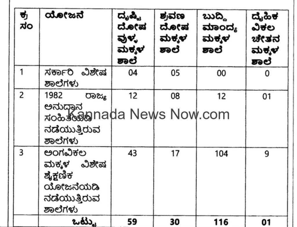 ಸರ್ಕಾರಿ ವಿಶೇಷ ಶಾಲೆಗಳು: ಸರ್ಕಾರವೇ ನೇರವಾಗಿ ನಡೆಸುತ್ತಿರುವ ಶಾಲೆಗಳಲ್ಲಿ ದೃಷ್ಟಿ ದೋಷವುಳ್ಳವರಿಗಾಗಿ 04 ಹಾಗೂ ಶ್ರವಣ ದೋಷವುಳ್ಳವರಿಗಾಗಿ 05 ಶಾಲೆಗಳಿವೆ.