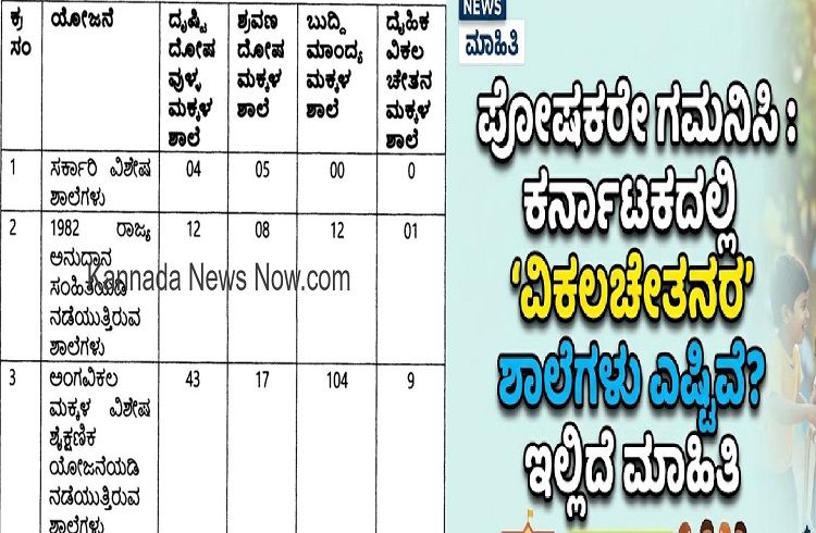 ಬೆಂಗಳೂರು: ರಾಜ್ಯದಲ್ಲಿ ವಿಕಲಚೇತನ ಮಕ್ಕಳ ಶೈಕ್ಷಣಿಕ ಅಭಿವೃದ್ಧಿಗಾಗಿ ಸರ್ಕಾರವು ವಿವಿಧ ಯೋಜನೆಗಳಡಿ ವಿಶೇಷ ಶಾಲೆಗಳನ್ನು ನಡೆಸುತ್ತಿದೆ. ಇತ್ತೀಚಿನ ಅಂಕಿಅಂಶಗಳ ಪ್ರಕಾರ, ದೃಷ್ಟಿ ದೋಷ, ಶ್ರವಣ ದೋಷ, ಬುದ್ಧಿಮಾಂದ್ಯತೆ ಹಾಗೂ ದೈಹಿಕ ವಿಕಲಚೇತನವುಳ್ಳ ಮಕ್ಕಳಿಗಾಗಿ ಒಟ್ಟು ನೂರಾರು ಶಾಲೆಗಳು ಕಾರ್ಯಾಚರಿಸುತ್ತಿವೆ.