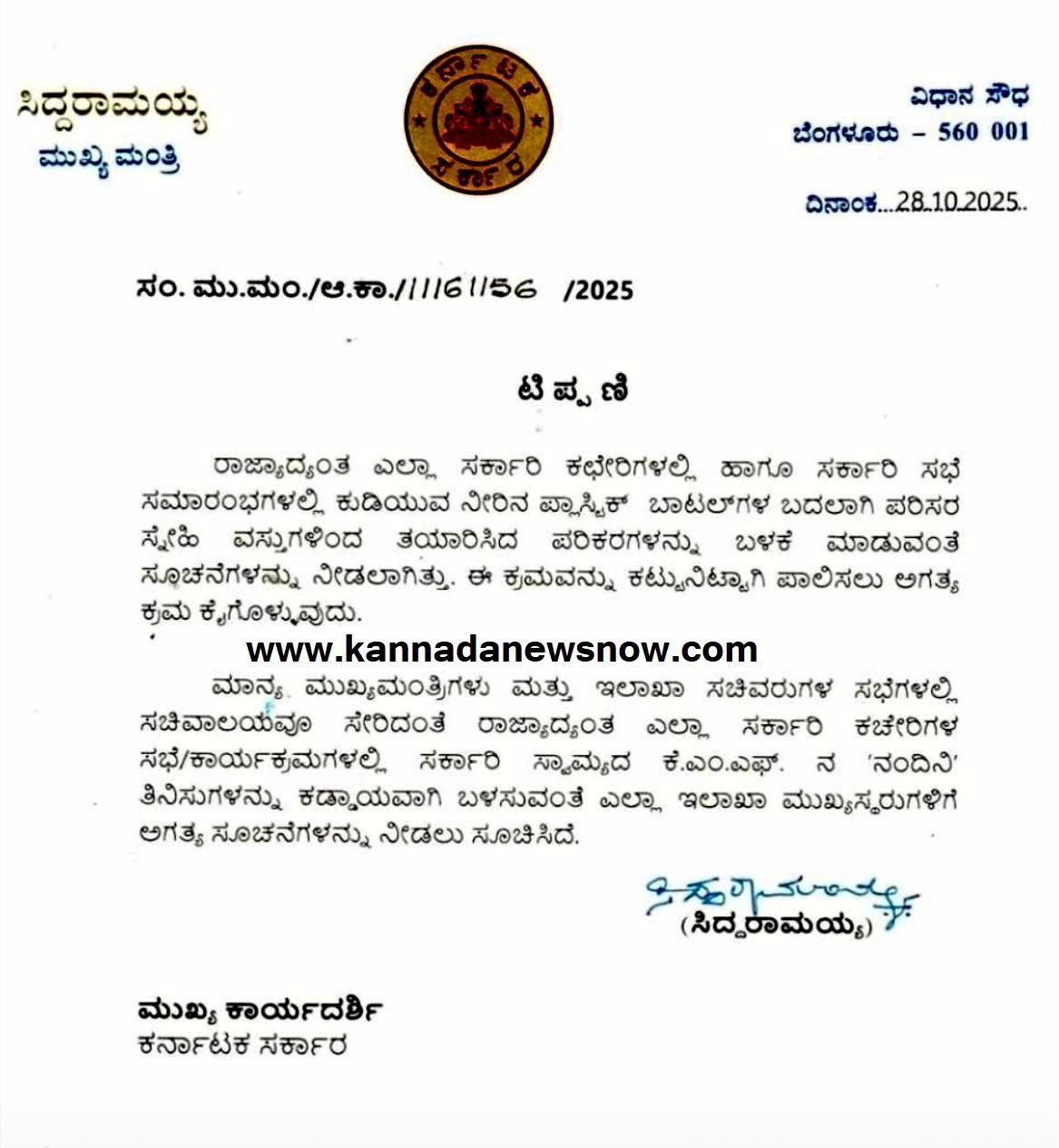 ಈ ಕುರಿತಂತೆ ರಾಜ್ಯ ಸರ್ಕಾರದ ಮುಖ್ಯ ಕಾರ್ಯದರ್ಶಿಯವರಿಗೆ ಟಿಪ್ಪಣಿ ಆದೇಶ ಹೊರಡಿಸಿರುವಂತ ಅವರು, ರಾಜ್ಯಾದ್ಯಂತ ಎಲ್ಲಾ ಸರ್ಕಾರಿ ಕಛೇರಿಗಳಲ್ಲಿ ಹಾಗೂ ಸರ್ಕಾರಿ ಸಭೆ ಸಮಾರಂಭಗಳಲ್ಲಿ ಕುಡಿಯುವ ನೀರಿನ ಪ್ಲಾಸ್ಟಿಕ್ ಬಾಟಲ್ಗಳ ಬದಲಾಗಿ ಪರಿಸರ ಸ್ನೇಹಿ ವಸ್ತುಗಳಿಂದ ತಯಾರಿಸಿದ ಪರಿಕರಗಳನ್ನು ಬಳಕೆ ಮಾಡುವಂತೆ ಸೂಚನೆಗಳನ್ನು ನೀಡಲಾಗಿತ್ತು. ಈ ಕ್ರಮವನ್ನು ಕಟ್ಟುನಿಟ್ಟಾಗಿ ಪಾಲಿಸಲು ಅಗತ್ಯ ಕ್ರಮ ಕೈಗೊಳ್ಳುವುದು ಎಂದು ಸೂಚಿಸಿದ್ದಾರೆ.