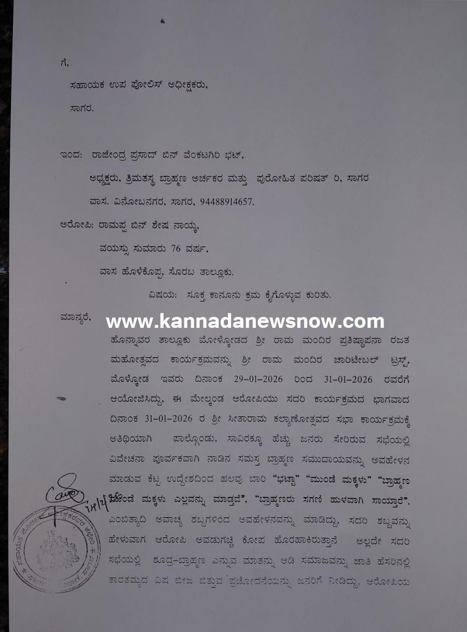 ಸಾಗರದ ತ್ರಿಮತಸ್ಥ ಬ್ರಾಹ್ಮಣ ಅರ್ಚಕರ ಮತ್ತು ಪುರೋಹಿತ ಪರಿಷತ್ ನೀಡಿರುವಂತ ದೂರಿನಲ್ಲಿ, ಹೊನ್ನಾವರ ತಾಲ್ಲೂಕು ಮೋಡದ ಶ್ರೀ ರಾಮ ಮಂದಿರ ಪ್ರತಿಷ್ಠಾಪನಾ ರಜತ ಮಹೋತ್ಸವದ ಕಾರ್ಯಕ್ರಮವನ್ನು ಶ್ರೀ ರಾಮ ಮಂದಿರ ಚಾರಿಟೇಬಲ್ ಟ್ರಸ್ಟ್, ಮೊಳ್ಕೊಡ ಇವರು ದಿನಾಂಕ 29-01-2026 ರಿಂದ 31-01-2026 ರವರೆಗೆ ಆಯೋಜಿಸಿದ್ದು, ಸದರಿ ಕಾರ್ಯಕ್ರಮದ ಭಾಗವಾದ ದಿನಾಂಕ 31-01-2026ರ ಶ್ರೀ ಸೀತಾರಾಮ ಕಲ್ಯಾಣೋತ್ಸವದ ಸಭಾ ಕಾರ್ಯಕ್ರಮಕ್ಕೆ ಅತಿಥಿಯಾಗಿ ಆರೋಪಿಯು ಪಾಲ್ಗೊಂಡು, ಸಾವಿರಕ್ಕೂ ಹೆಚ್ಚು ಜನರು ಸೇರಿರುವ ಸಭೆಯಲ್ಲಿ ವಿವೇಚನಾ ಪೂರ್ವಕವಾಗಿ ನಾಡಿನ ಸಮಸ್ತ ಬ್ರಾಹ್ಮಣ ಸಮುದಾಯವನ್ನು ಅವಹೇಳನ ಮಾಡುವ ಕೆಟ್ಟ ಉದ್ದೇಶದಿಂದ ಹಲವು ಬಾರಿ “ಭಟ್ಟಾ” “ಮುಂಡೆ ಮಕ್ಕಳು” “ಬ್ರಾಹ್ಮಣ ಚಂಡೆ ಮಕ್ಕಳು ಎಲ್ಲವನ್ನು ಮಾಡ್ತವೆ”, “ಬ್ರಾಹ್ಮಣರು ಸಗಣಿ ಹುಳವಾಗಿ ಸಾಯ್ತಾರೆ” ಎಂಬಿತ್ಯಾದಿ ಅವಾಚ್ಯ ಶಬ್ದಗಳಿಂದ ಅವಹೇಳನವನ್ನು ಮಾಡಿದ್ದಾರೆ ಎಂಬುದಾಗಿ ಉಲ್ಲೇಖಿಸಿದ್ದಾರೆ.
