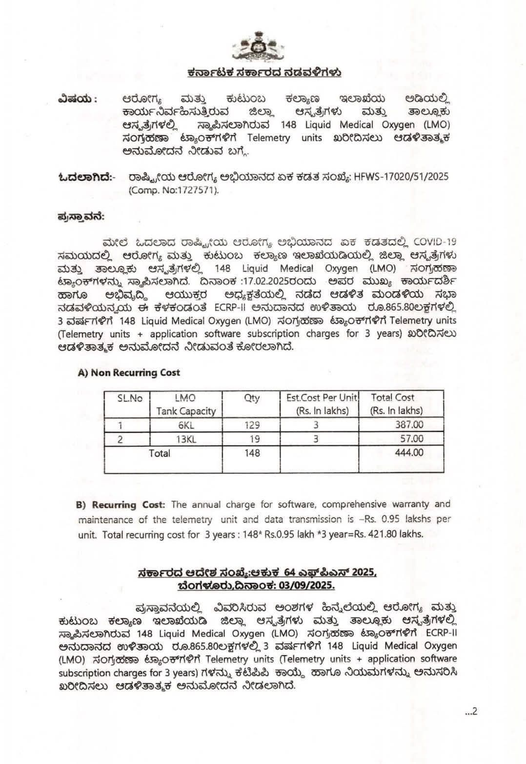 148 Liquid Medical Oxygen (LMO) ಪ್ರಸ್ತಾವನೆಯಲ್ಲಿ ವಿವರಿಸಿರುವ ಅಂಶಗಳ ಹಿನ್ನೆಲೆಯಲ್ಲಿ ಆರೋಗ್ಯ ಮತ್ತು ಕುಟುಂಬ ಕಲ್ಯಾಣ ಇಲಾಖೆಯಡಿ ಜಿಲ್ಲಾ ಆಸ್ಪತ್ರೆಗಳು ಮತ್ತು ತಾಲ್ಲೂಕು ಆಸ್ಪತ್ರೆಗಳಲ್ಲಿ ECRP-II ಅನುದಾನದ ಉಳಿತಾಯ ರೂ.865.80ಲಕ್ಷಗಳಲ್ಲಿ 3 ವರ್ಷಗಳಿಗೆ 148 Liquid Medical Oxygen (LMO) Telemetry units (Telemetry units application software subscription charges for 3 years) ಗಳನ್ನು ಕೆಟಿಪಿಪಿ ಕಾಯ್ದೆ ಹಾಗೂ ನಿಯಮಗಳನ್ನು ಅನುಸರಿಸಿ ಖರೀದಿಸಲು ಆಡಳಿತಾತ್ಮಕ ಅನುಮೋದನೆ ನೀಡಲಾಗಿದೆ.