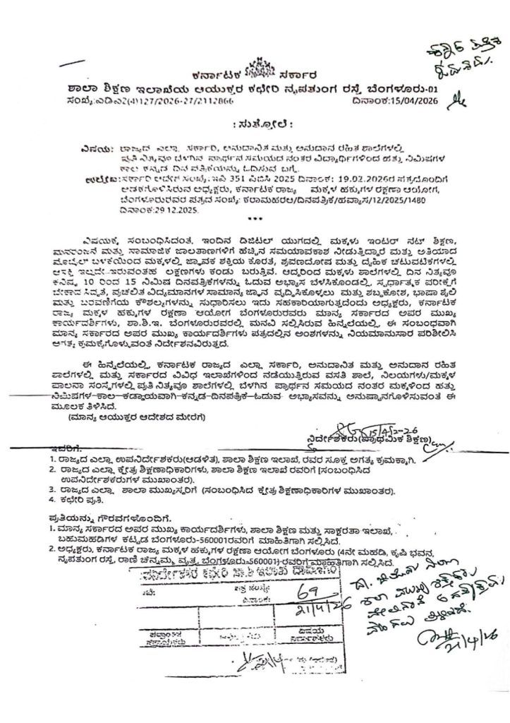 ಶಾಲೆಗಳಲ್ಲಿ ಪ್ರತಿ ದಿನ 10 ನಿಮಿಷ ಕನ್ನಡ ಪತ್ರಿಕೆ ಓದುವುದನ್ನು ಕಡ್ಡಾಯಗೊಳಿಸಿ ಶಾಲಾ ಶಿಕ್ಷಣ ಇಲಾಖೆ ಆದೇಶಿಸಿದೆ.#KarnatakaSchools pic.twitter.com/gdc6xYuFUX