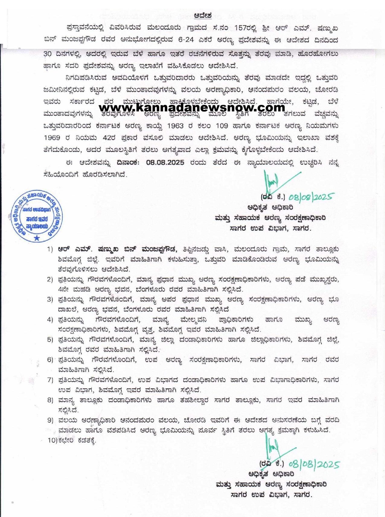ಪ್ರಸ್ತಾವನೆಯಲ್ಲಿ ವಿವರಿಸಿರುವ ಮಲಂದೂರು ಗ್ರಾಮದ ಸ.ನಂ 157ರಲ್ಲಿ ಆರ್ ಎಮ್. ಷಣ್ಮುಖ ಬಿನ್ ಮಂಜಪ್ಪಗೌಡ ಅವರ ಅನುಭೋಗದಲ್ಲಿರುವ 6-24 ಎಕರೆ ಅರಣ್ಯ ಪ್ರದೇಶವನ್ನು ಈ ಆದೇಶದ ದಿನದಿಂದ ಮತ್ತು 30 ದಿನಗಳಲ್ಲಿ, ಅದರಲ್ಲಿ ಇರುವ ಬೆಳೆ ಹಾಗೂ ಇತರೆ ರಚನೆಗಳಿರುವ ಸೊತ್ತನ್ನು ತೆರವು ಮಾಡಿ, ಹೊರಹೋಗಲು ಹಾಗೂ ಸದರಿ ಪ್ರದೇಶವನ್ನು ಅರಣ್ಯ ಇಲಾಖೆಗೆ ವಹಿಸಿಕೊಡಲು ಆದೇಶಿಸಿದ್ದಾರೆ.
