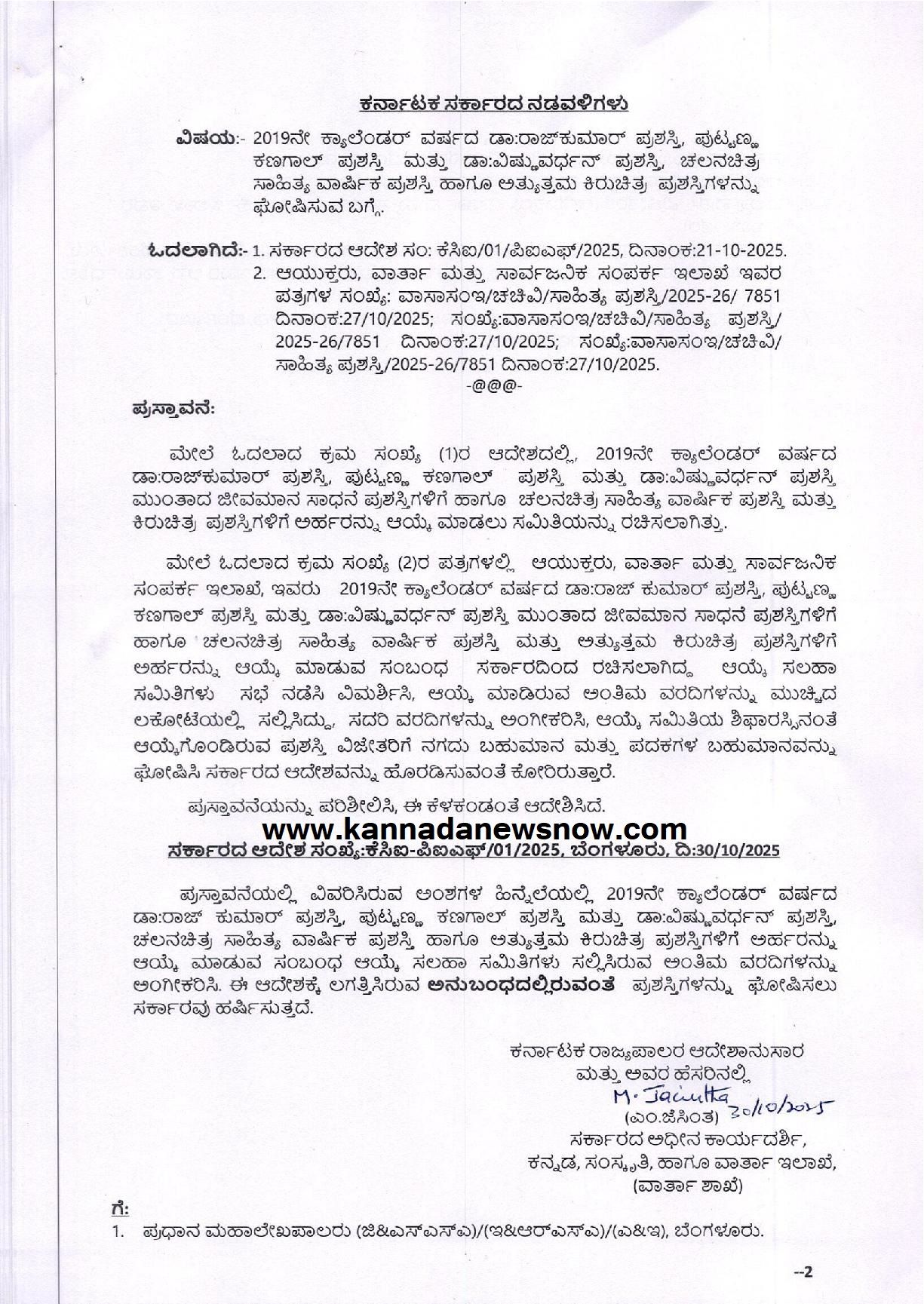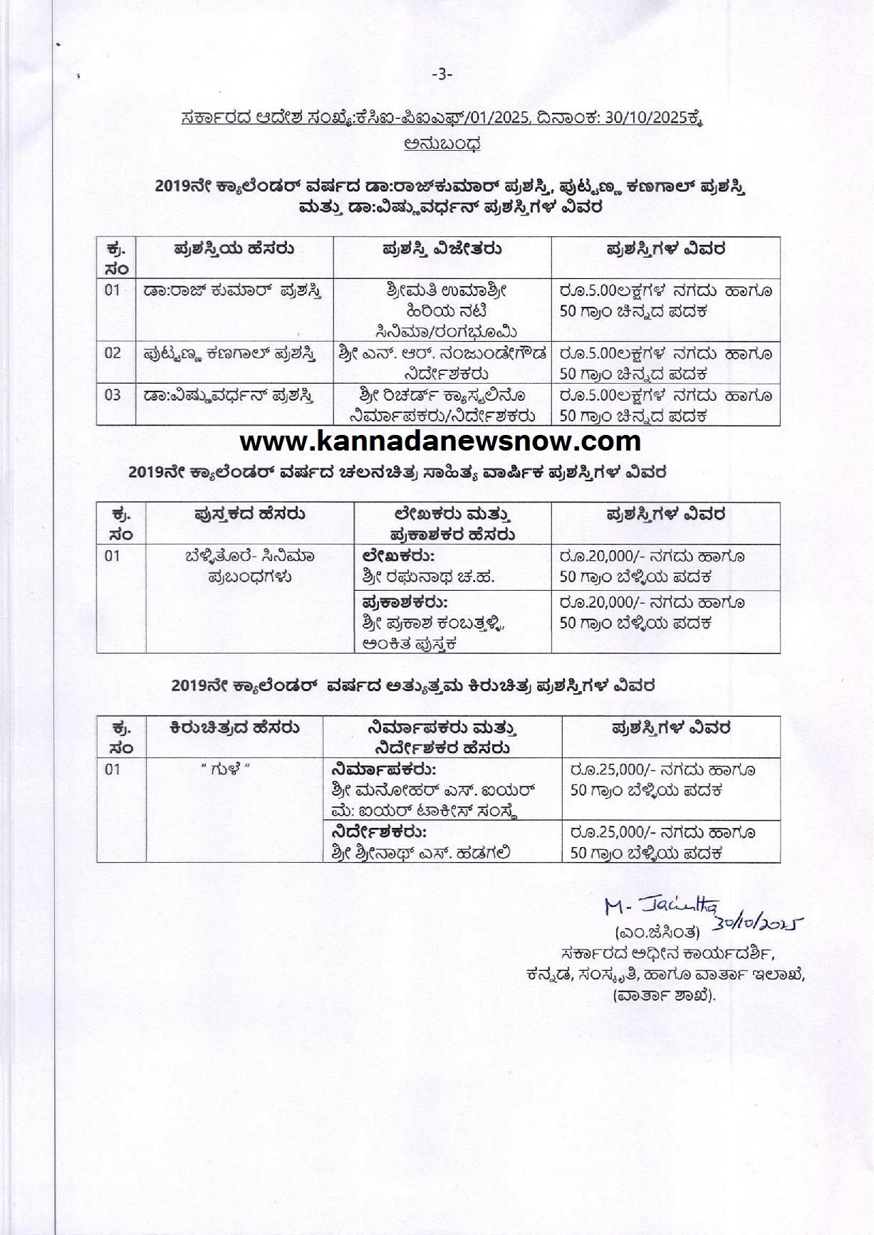 ಈ ಸಂಬಂಧ ಕನ್ನಡ, ಸಂಸ್ಕೃತಿ ಮತ್ತು ವಾರ್ತಾ ಇಲಾಖೆಯ ಸರ್ಕಾರದ ಅಧೀನ ಕಾರ್ಯದರ್ಶಿ ನಡವಳಿಯನ್ನು ಹೊರಡಿಸಿದ್ದು, 2019ನೇ ಕ್ಯಾಲೆಂಡರ್ ವರ್ಷದ ಡಾ.ರಾಜ್ ಕುಮಾರ್ ಪ್ರಶಸ್ತಿ, ಪುಟ್ಟಣ್ಣ ಕಣಗಾಲ್ ಪ್ರಶಸ್ತಿ ಮತ್ತು ಡಾ.ವಿಷ್ಣುವರ್ಧನ್ ಪ್ರಶಸ್ತಿ, ಚಲನಚಿತ್ರ ಸಾಹಿತ್ಯ ವಾರ್ಷಿಕ ಪ್ರಶಸ್ತಿ ಹಾಗೂ ಅತ್ಯುತ್ತಮ ಕಿರುಚಿತ್ರ ಪ್ರಶಸ್ತಿಗೆ ಅರ್ಹರನ್ನು ಆಯ್ಕೆ ಮಾಡಿರುವುದಾಗಿ ತಿಳಿಸಿದ್ದಾರೆ.