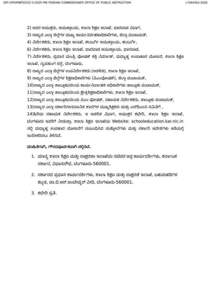 ಶಾಲೆಗಳಲ್ಲಿ ಬಿಸಿಯೂಟ, ಕ್ಷೀರಭಾಗ್ಯ ಮತ್ತು ಪೂರಕ ಪೌಷ್ಟಿಕ ಆಹಾರ ವಿತರಣೆ ಕಾರ್ಯಕ್ರಮವು ಯಾವುದೇ ಅಡೆತಡೆಯಿಲ್ಲದೆ ಸುಗಮವಾಗಿ ನಡೆಯಲು ಶಾಲಾ ಮುಖ್ಯ ಶಿಕ್ಷಕರು, ಎಸ್ಡಿಎಂಸಿ (SDMC), ತಾಲೂಕು ಮತ್ತು ಜಿಲ್ಲಾ ಮಟ್ಟದ ಅಧಿಕಾರಿಗಳು ಅಗತ್ಯ ಕ್ರಮ ಕೈಗೊಳ್ಳಬೇಕು. ಈ ವಿಚಾರದಲ್ಲಿ ಯಾವುದೇ ದೂರುಗಳಿಗೆ ಆಸ್ಪದ ನೀಡದಂತೆ ಎಚ್ಚರವಹಿಸಿ, ಯೋಜನೆಯ ಯಶಸ್ಸಿಗೆ ಶ್ರಮಿಸುವಂತೆ ಶಾಲಾ ಶಿಕ್ಷಣ ಇಲಾಖೆಯ ಆಯುಕ್ತರಾದ ವಿಕಾಸ್ ಕಿಶೋರ್ ಸುರಳ್ಕರ್ ಅವರು ಹೊರಡಿಸಿರುವ ಸುತ್ತೋಲೆಯಲ್ಲಿ ತಿಳಿಸಿದ್ದಾರೆ.