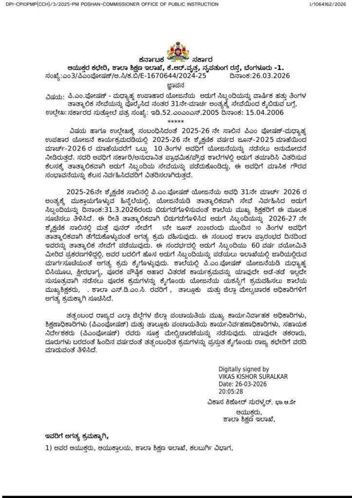 2025-26ನೇ ಸಾಲಿನಲ್ಲಿ ಜೂನ್ 2025 ರಿಂದ ಮಾರ್ಚ್ 2026ರ ವರೆಗೆ ಒಟ್ಟು 10 ತಿಂಗಳ ಅವಧಿಗೆ ಅಡುಗೆ ಸಿಬ್ಬಂದಿಯ ಸೇವೆಯನ್ನು ಪಡೆಯಲಾಗಿತ್ತು. ಇದೀಗ ಶೈಕ್ಷಣಿಕ ವರ್ಷ ಮುಕ್ತಾಯಗೊಳ್ಳುತ್ತಿರುವ ಹಿನ್ನೆಲೆಯಲ್ಲಿ ಮಾರ್ಚ್ 31, 2026 ರಂದು ಎಲ್ಲಾ ಅಡುಗೆ ಸಿಬ್ಬಂದಿಯನ್ನು ತಾತ್ಕಾಲಿಕವಾಗಿ ಬಿಡುಗಡೆಗೊಳಿಸುವಂತೆ ಶಾಲಾ ಮುಖ್ಯ ಶಿಕ್ಷಕರಿಗೆ ಇಲಾಖೆ ಕಟ್ಟುನಿಟ್ಟಿನ ಸೂಚನೆ ನೀಡಿದೆ. ತದನಂತರ ಮುಂದಿನ ಶೈಕ್ಷಣಿಕ ವರ್ಷದ ಪ್ರಾರಂಭದ ದಿನವಾದ ಜೂನ್ 1, 2026 ರಂದು ಇದೇ ಸಿಬ್ಬಂದಿಯನ್ನು ಮುಂದಿನ 10 ತಿಂಗಳ ಅವಧಿಗೆ ಮತ್ತೆ ತಾತ್ಕಾಲಿಕವಾಗಿ ಸೇವೆಗೆ ತೆಗೆದುಕೊಳ್ಳುವಂತೆ ನಿರ್ದೇಶನ ನೀಡಲಾಗಿದೆ.