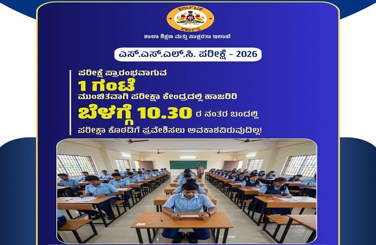 2026 ರ ಎಸ್.ಎಸ್.ಎಲ್.ಸಿ. ಪರೀಕ್ಷೆ-1 ಮಾರ್ಚ್ 18, 2026 ರಿಂದ ಆರಂಭವಾಗಲಿವೆ. ಪರೀಕ್ಷೆ ಬರೆಯುವ ವಿದ್ಯಾರ್ಥಿಗಳು ಪರೀಕ್ಷೆ ಪ್ರಾರಂಭವಾಗುವ ಒಂದು ಗಂಟೆ ಮುಂಚಿತವಾಗಿ ಪರೀಕ್ಷಾ ಕೇಂದ್ರದಲ್ಲಿ ಹಾಜರಿರಬೇಕು. ಬೆಳಗ್ಗೆ 10.30ರ ನಂತರ ಬಂದಲ್ಲಿ ಪರೀಕ್ಷಾ ಕೊಠಡಿಗೆ ಪ್ರವೇಶಿಸಲು ಅವಕಾಶವಿರುವುದಿಲ್ಲ.