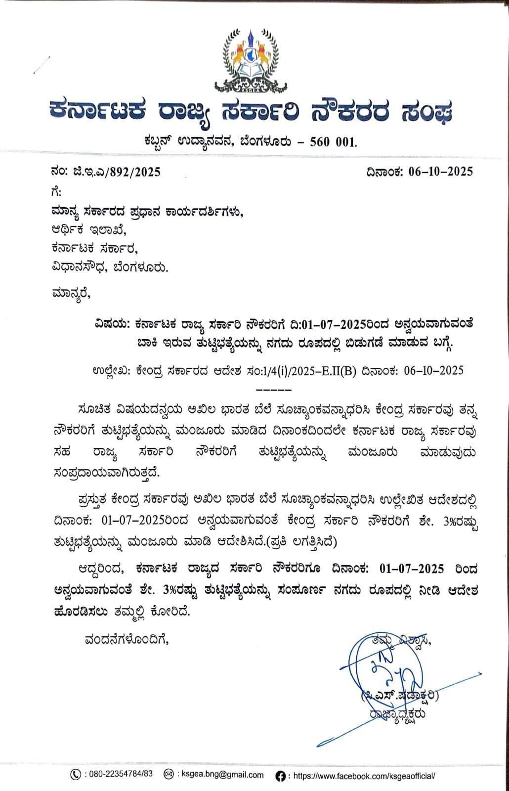 ಆದ್ದರಿಂದ, ಕರ್ನಾಟಕ ರಾಜ್ಯದ ಸರ್ಕಾರಿ ನೌಕರರಿಗೂ ದಿನಾಂಕ: 01-07-2025 ರಿಂದ ಅನ್ವಯವಾಗುವಂತೆ ಶೇ. 3%ರಷ್ಟು ತುಟ್ಟಿಭತ್ಯೆಯನ್ನು ಸಂಪೂರ್ಣ ನಗದು ರೂಪದಲ್ಲಿ ನೀಡಿ ಆದೇಶ ಹೊರಡಿಸಲು ಕೋರಿದೆ.