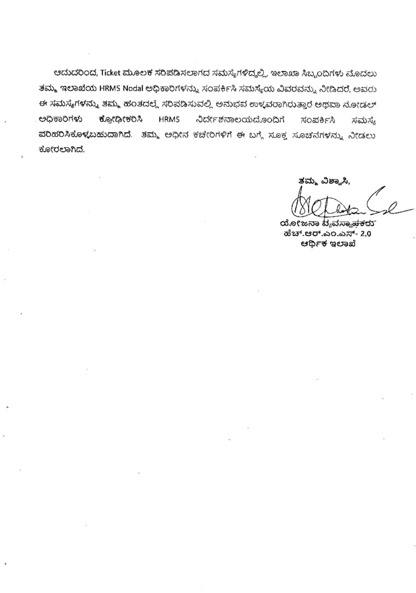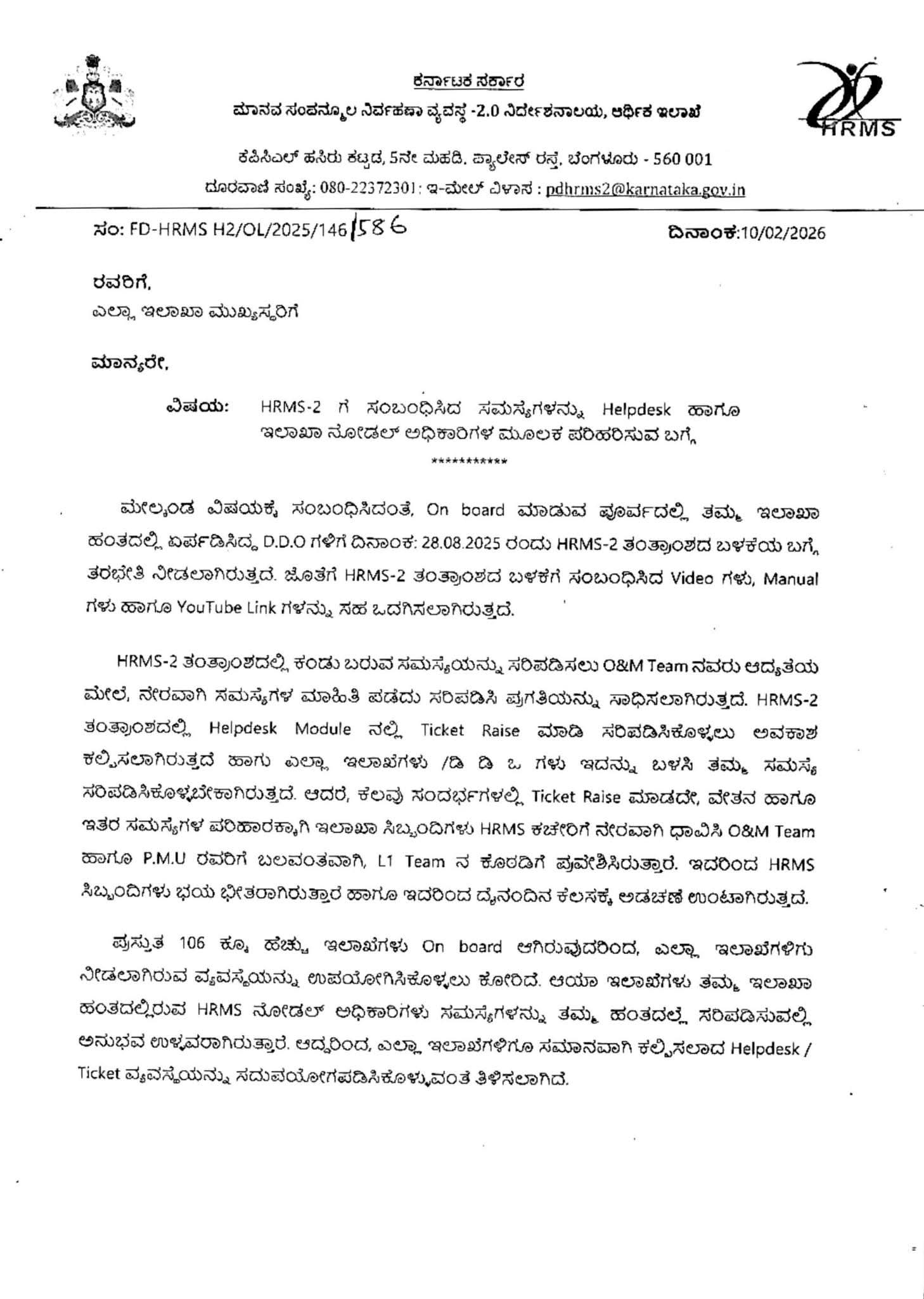 ಪ್ರಸ್ತುತ 106 ಕ್ಕೂ ಹೆಚ್ಚು ಇಲಾಖೆಗಳು On board ಆಗಿರುವುದರಿಂದ ಎಲ್ಲಾ ಇಲಾಖೆಗಳಿಗು ನೀಡಲಾಗಿರುವ ವ್ಯವಸ್ಥೆಯನ್ನು ಉಪಯೋಗಿಸಿಕೊಳ್ಳಲು ಕೋರಿದೆ. ಆಯಾ ಇಲಾಖೆಗಳು ತಮ್ಮ ಇಲಾಖಾ ಹಂತದಲ್ಲಿರುವ HRMS ನೋಡಲ್ ಅಧಿಕಾರಿಗಳು ಸಮಸ್ಯೆಗಳನ್ನು ತಮ್ಮ ಹಂತದಲ್ಲ ಸರಿಪಡಿಸುವಲ್ಲಿ ಅನುಭವ ಉಳ್ಳವರಾಗಿರುತ್ತಾರೆ. ಆದ್ದರಿಂದ, ಎಲ್ಲಾ ಇಲಾಖೆಗಳಿಗೂ ಸಮಾನವಾಗಿ ಕಲ್ಪಿಸಲಾದ Helpdesk /Ticket ವ್ಯವಸ್ಥೆಯನ್ನು ಸದುಪಯೋಗಪಡಿಸಿಕೊಳ್ಳುವಂತೆ ತಿಳಿಸಲಾಗಿದೆ.