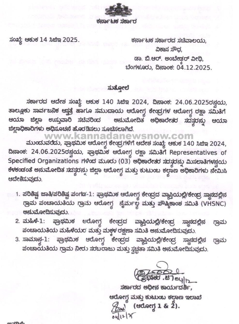 ಮುಂದುವರೆದು, ಪ್ರಾಥಮಿಕ ಆರೋಗ್ಯ ಕೇಂದ್ರಗಳಿಗೆ ಆದೇಶ ಸಂಖ್ಯೆ: ಆಕುಕ 140 ಸಿಜಿಇ 2024, ದಿನಾಂಕ: 24.06.2025ರನ್ವಯ, ಪ್ರಾಥಮಿಕ ಆರೋಗ್ಯ ರಕ್ಷಾ ಸಮಿತಿಗೆ Representatives of Specified Organizations ಗಳಿಂದ ಮೂರು (03) ಅಧಿಕಾರೇತರ ಸದಸ್ಯರನ್ನು ಮಿಸಲಾತಿಗಳನ್ವಯ ಕೆಳಕಂಡಂತೆ ಅನುಮೋದಿತ ಸದಸ್ಯರನ್ನು ಜಿಲ್ಲಾ ಆರೋಗ್ಯ ಮತ್ತು ಕುಟುಂಬ ಕಲ್ಯಾಣ ಅಧಿಕಾರಿಗಳು ನೇಮಿಸಿ ಆದೇಶಿಸುವಂತೆ ತಿಳಿಸಲಾಗಿದೆ.