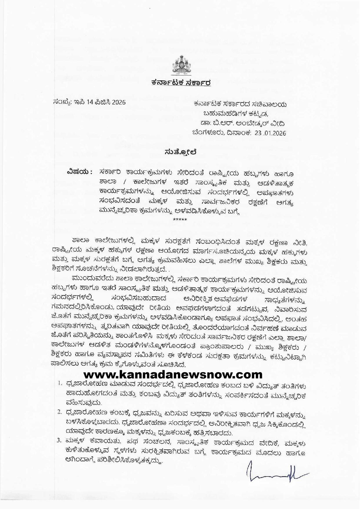 ಬೆಂಗಳೂರು: ರಾಜ್ಯದಲ್ಲಿ ಸರ್ಕಾರಿ ಕಾರ್ಯಕ್ರಮಗಳು ಸೇರಿದಂತೆ ರಾಷ್ಟ್ರೀಯ ಹಬ್ಬಗಳು ಹಾಗೂ ಶಾಲಾ-ಕಾಲೇಜುಗಳ ಇತರೆ ಸಾಂಸ್ಕೃತಿಕ ಮತ್ತು ಆಡಳಿತಾತ್ಮಕ ಕಾರ್ಯಕ್ರಮಗಳನ್ನು ಆಯೋಜಿಸುವ ಸಂದರ್ಭಗಳಲ್ಲಿ ಅಪಘಾತಗಳು ಸಂಭವಿಸದಂತೆ ಮಕ್ಕಳ ಮತ್ತು ಸಾರ್ವಜನಿಕರ ರಕ್ಷಣೆಗೆ ಈ ಅಗತ್ಯ ಮುನ್ನೆಚ್ಚರಿಕಾ ಕ್ರಮಗಳನ್ನು ಅಳಡಿಸಿಕೊಳ್ಳುವಂತೆ ಸರ್ಕಾರ ಖಡಕ್ ಆದೇಶ ಮಾಡಿದೆ.