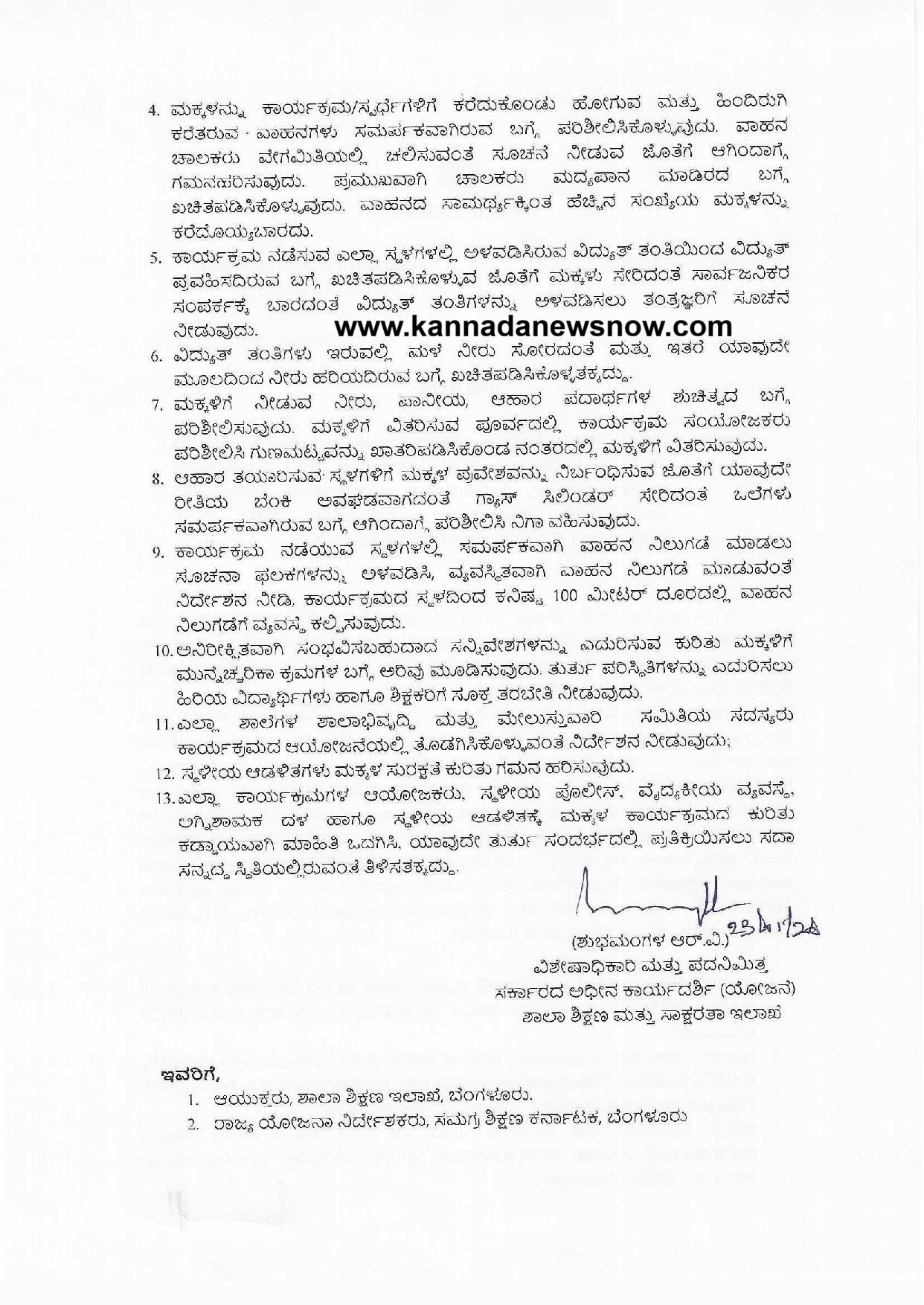 ಮುಂದುವರೆದು ಶಾಲಾ ಕಾಲೇಜುಗಳಲ್ಲಿ ಸರ್ಕಾರಿ ಕಾರ್ಯಕ್ರಮಗಳು ಸೇರಿದಂತೆ ರಾಷ್ಟ್ರೀಯ ಹಬ್ಬಗಳು ಹಾಗೂ ಇತರ ಸಾಂಸ್ಕೃತಿಕ ಮತ್ತು ಆಡಳಿತಾತ್ಮಕ ಕಾರ್ಯಕ್ರಮಗಳನ್ನು ಆಯೋಜಿಸುವ ಸಂದರ್ಭಗಳಲ್ಲಿ ಸಂಭವಿಸಬಹುದಾದ ಅನಿರೀಕ್ಷಿತ ಅವಘಡಗಳ ಸಾಧ್ಯತೆಗಳನ್ನು ಗಮನದಲ್ಲಿರಿಸಿಕೊಂಡು, ಯಾವುದೇ ರೀತಿಯ ಅವಘಡಗಳಾಗದಂತೆ ತಡೆಗಟ್ಟುವ, ನಿವಾರಿಸುವ ಜೊತೆಗೆ ಮುನ್ನೆಚ್ಚರಿಕಾ ಕ್ರಮಗಳನ್ನು ಅಳವಡಿಸಿಕೊಂಡಾಗೂ ಅಪಘಾತ ಸಂಭವಿಸಿದಲ್ಲಿ, ಅಂತಹ ಅಪಘಾತಗಳನ್ನು ತ್ವರಿತವಾಗಿ ಯಾವುದೇ ರೀತಿಯಲ್ಲಿ ತೊಂದರೆಯಾಗದಂತೆ ನಿರ್ವಹಣೆ ಮಾಡುವ ಜೊತೆಗೆ ಪರಿಸ್ಥಿತಿಯನ್ನು ಶಾಂತಗೊಳಿಸಿ ಮಕ್ಕಳು ಸೇರಿದಂತೆ ಸಾರ್ವಜನಿಕರ ರಕ್ಷಣೆಗೆ ಎಲ್ಲಾ ಶಾಲಾ/ ಕಾಲೇಜುಗಳ ಆಡಳಿತ ಮಂಡಳಿಗಳನ್ನೊಳಗೊಂಡಂತೆ ಪ್ರಾಂಶುಪಾಲರು / ಮುಖ್ಯ ಶಿಕ್ಷಕರು | ಶಿಕ್ಷಕರು ಹಾಗೂ ವ್ಯವಸ್ಥಾಪನ ಸಮಿತಿಗಳು ಈ ಕೆಳಕಂಡ ಸುರಕ್ಷತಾ ಕ್ರಮಗಳನ್ನು ಕಟ್ಟುನಿಟ್ಟಾಗಿ ಪಾಲಿಸಲು ಅಗತ್ಯ ಕ್ರಮ ಕೈಗೊಳ್ಳುವಂತೆ ಸೂಚಿಸಿದೆ.