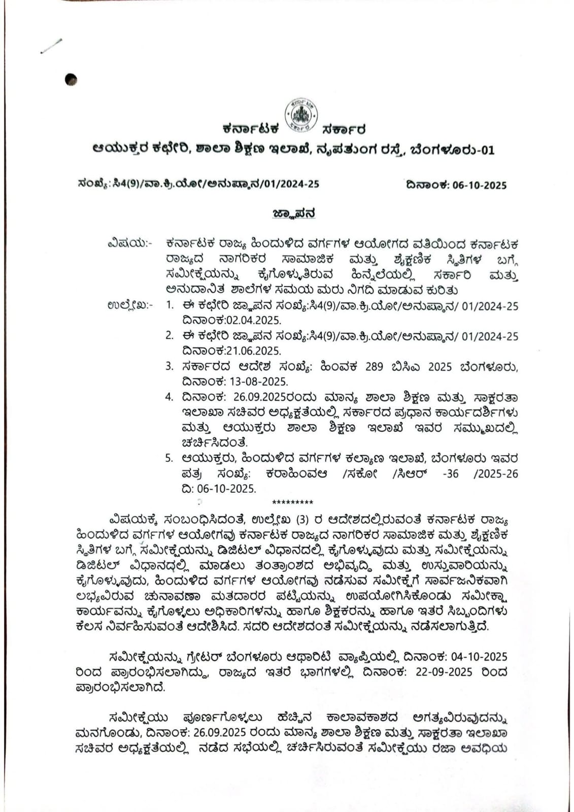 ಸಮೀಕ್ಷೆ ಪೂರ್ಣಗೊಳಿಸಲು ಇನ್ನೂ ಹೆಚ್ಚಿನ ಕಾಲಾವಕಾಶದ ಅಗತ್ಯವಿರುವುದಾಗಿ ತಿಳಿಸಿರುವ ಹಿನ್ನೆಲೆಯಲ್ಲಿ, ಶಾಲಾ ವಿದ್ಯಾರ್ಥಿಗಳ ಶೈಕ್ಷಣಿಕ ಹಿತದೃಷ್ಟಿಯಿಂದ ಮಧ್ಯವಾರ್ಷಿಕ ರಜಾ ದಿನಗಳ ನಂತರ ಶಾಲಾ ತರಗತಿಗಳು ಸಮೀಕ್ಷೆಯ ಕಾರಣದಿಂದ ಕುಂಠಿತವಾಗಬಾರದು ಎನ್ನುವ ದೃಷ್ಟಿಯಿಂದ ಈ ಕೆಳಗಿನ ಸೂಚನೆಗಳಂತೆ ಕಮವಹಿಸುವುದು.