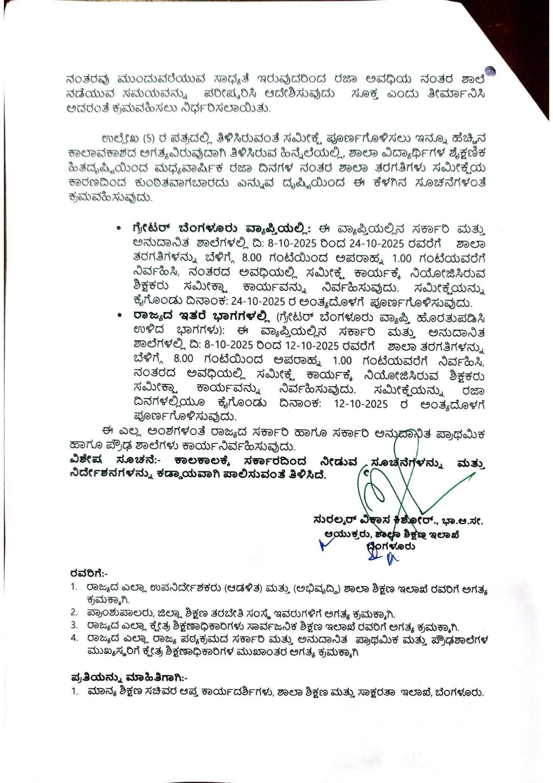 ರಾಜ್ಯದ ಇತರೆ ಭಾಗಗಳಲ್ಲಿ (ಗ್ರೇಟರ್ ಬೆಂಗಳೂರು ವ್ಯಾಪ್ತಿ ಹೊರತುಪಡಿಸಿ ಉಳಿದ ಭಾಗಗಳು): ಈ ವ್ಯಾಪ್ತಿಯಲ್ಲಿನ ಸರ್ಕಾರಿ ಮತ್ತು ಅನುದಾನಿತ ಶಾಲೆಗಳಲ್ಲಿ ದಿ: 8-10-2025 ರಿಂದ 12-10-2025 ರವರೆಗೆ ಶಾಲಾ ತರಗತಿಗಳನ್ನು ಬೆಳಿಗ್ಗೆ 8.00 ಗಂಟೆಯಿಂದ ಅಪರಾಹ್ನ 1.00 ಗಂಟೆಯವರೆಗೆ ನಿರ್ವಹಿಸಿ, ನಂತರದ ಅವಧಿಯಲ್ಲಿ ಸಮೀಕ್ಷೆ ಕಾರ್ಯಕ್ಕೆ ನಿಯೋಜಿಸಿರುವ ಶಿಕ್ಷಕರು ಸಮೀಕ್ಷಾ ಕಾರ್ಯವನ್ನು ನಿರ್ವಹಿಸುವುದು. ಸಮೀಕ್ಷೆಯನ್ನು ರಜಾ ದಿನಗಳಲ್ಲಿಯೂ ಕೈಗೊಂಡು ದಿನಾಂಕ: 12-10-2025 ರ ಅಂತ್ಯದೊಳಗೆ ಪೂರ್ಣಗೊಳಿಸುವುದು.ಈ ಎಲ್ಲ ಅಂಶಗಳಂತೆ ರಾಜ್ಯದ ಸರ್ಕಾರಿ ಹಾಗೂ ಸರ್ಕಾರಿ ಅನುದಾನಿತ ಪ್ರಾಥಮಿಕ ಹಾಗೂ ಪ್ರೌಢ ಶಾಲೆಗಳು ಕಾರ್ಯನಿರ್ವಹಿಸುವುದು ಎಂದಿದೆ.