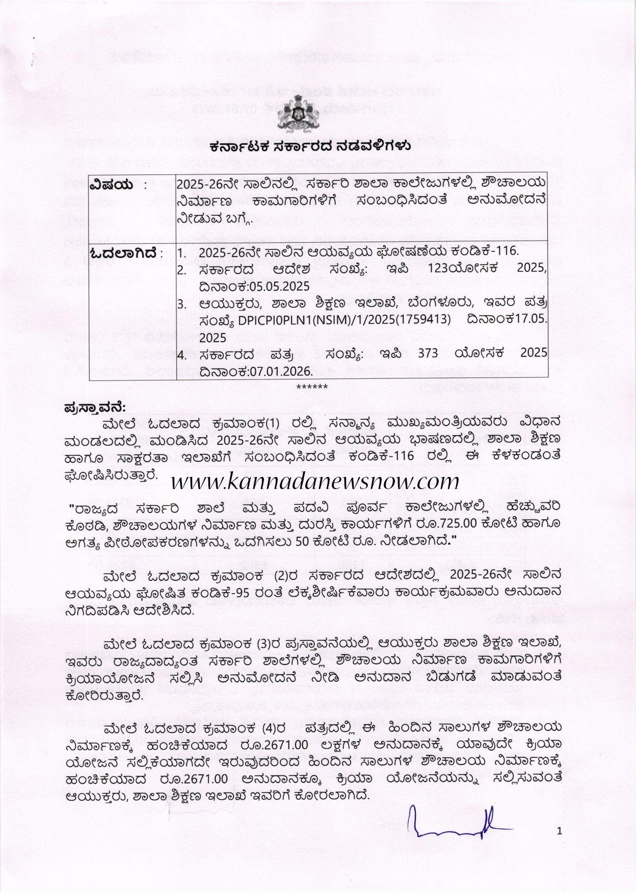 2025-26ನೇ ಸಾಲಿನ ಆಯವ್ಯಯ ಘೋಷಣೆಯ ಕಂಡಿಕೆ ಸಂಖ್ಯೆ: 116 ರನ್ವಯ ಸರ್ಕಾರಿ ಶಾಲೆಗಳ ಮೂಲಭೂತ ಸೌಲಭ್ಯಗಳನ್ನು ಒದಗಿಸಲು ಶಾಲಾ ಶೌಚಾಲಯ ನಿರ್ಮಾಣಕ್ಕೆ 2025- 26 F 4202-01-201-1-04-139 Insfrastructure for Primary Schools and High Schools on 4202-01-201-1-07-139 Toilet facilities for schools ನಿಗದಿಪಡಿಸಿರುವ ಅನುದಾನದಿಂದ 6328.00 ಲಕ್ಷಗಳ ವೆಚ್ಚದಲ್ಲಿ ರಾಜ್ಯವಲಯ ಮುಂದುವರೆದ ಯೋಜನೆಯಡಿ 1250 ಸರ್ಕಾರಿ ಶಾಲೆಗಳ 1582 (1582 for Boys and Girls) ಶಾಲಾ ಶೌಚಾಲಯ ನಿರ್ಮಾಣ ಕಾಮಗಾರಿಗಳಿಗೆ ಅನುಬಂಧ-1 ರಿಂದ 5 ರಲ್ಲಿರುವಂತೆ ಕ್ರಿಯಾ ಯೋಜನೆ ಅನುಷ್ಟಾನಗೊಳಿಸಲು ಆಯುಕ್ತರು, ಶಾಲಾ ಶಿಕ್ಷಣ ಇಲಾಖೆ ಇವರಿಗೆ ಅನುಮೋದನೆ ನೀಡಿ ಆದೇಶಿಸಿದೆ.