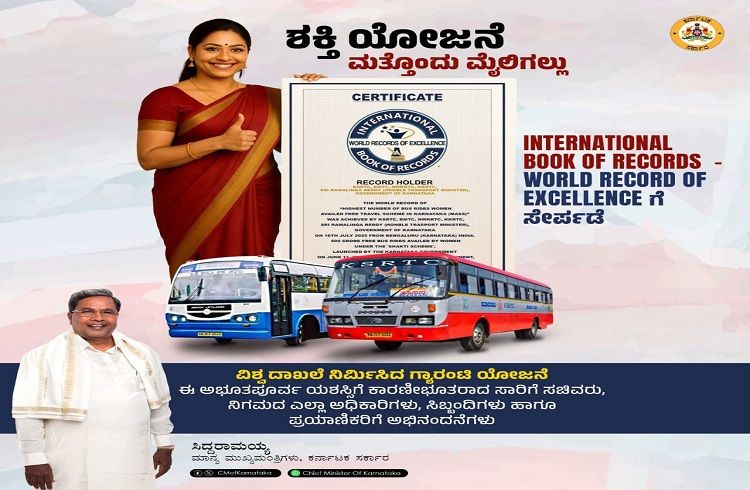 ರಾಜ್ಯ ಸರ್ಕಾರದ `ಶಕ್ತಿ ಯೋಜನೆ’ ಮತ್ತೊಂದು ಮೈಲಿಗಲ್ಲು : ‘ಇಂಟರ್ ನ್ಯಾಷನಲ್ ಬುಕ್ ಆಫ್ ರೆಕಾರ್ಡ್ಸ್’ಗೆ ಸೇರ್ಪಡೆ