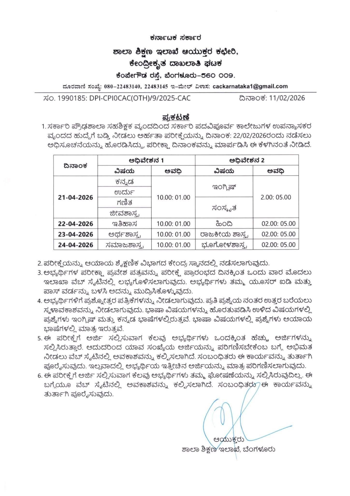 ಬೆಂಗಳೂರು : ಸರ್ಕಾರಿ ಪ್ರೌಢಶಾಲಾ ಸಹಶಿಕ್ಷಕ ವೃಂದದಿಂದ ಸರ್ಕಾರಿ ಪದವಿಪೂರ್ವ ಕಾಲೇಜುಗಳ ಉಪನ್ಯಾಸಕರ ವೃಂದದ ಹುದ್ದೆಗೆ ಬಡ್ತಿ ನೀಡಲು ಅರ್ಹತಾ ಪರೀಕ್ಷೆಯನ್ನು ದಿನಾಂಕ: 22/02/2026ರಂದು ನಡೆಸಲು ಅಧಿಸೂಚನೆಯನ್ನು ಹೊರಡಿಸಿದ್ದು, ಪರೀಕ್ಷಾ ದಿನಾಂಕವನ್ನು ಮಾರ್ಪಡಿಸಿ ಈ ಕೆಳಗಿನಂತೆ ನೀಡಿದೆ.
