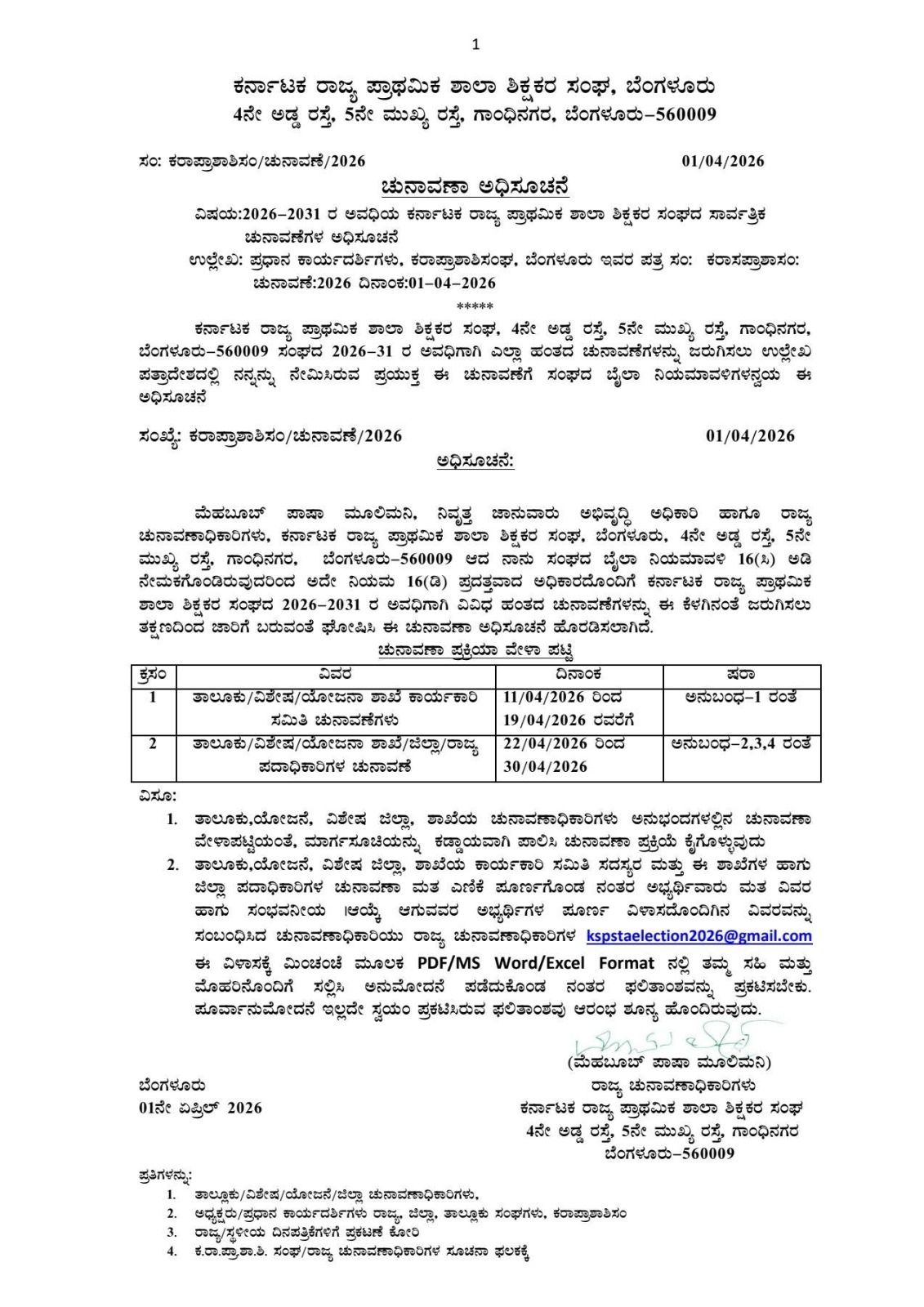 ಬೆಂಗಳೂರು: ಕರ್ನಾಟಕ ರಾಜ್ಯ ಪ್ರಾಥಮಿಕ ಶಾಲಾ ಶಿಕ್ಷಕರ ಸಂಘದ 2026 ರಿಂದ 2031ರ ಅವಧಿಗಾಗಿ ವಿವಿಧ ಹಂತಗಳ ಚುನಾವಣೆಗೆ ಅಧಿಕೃತ ಅಧಿಸೂಚನೆ ಹೊರಬಿದ್ದಿದೆ. ರಾಜ್ಯ ಚುನಾವಣಾಧಿಕಾರಿಯಾಗಿ ನೇಮಕಗೊಂಡಿರುವ ನಿವೃತ್ತ ಜಾನುವಾರು ಅಭಿವೃದ್ಧಿ ಅಧಿಕಾರಿ ಮೆಹಬೂಬ್ ಪಾಷಾ ಮೂಲಿಮನಿ ಅವರು ಈ ಕುರಿತು ಪ್ರಕಟಣೆ ಹೊರಡಿಸಿದ್ದಾರೆ.