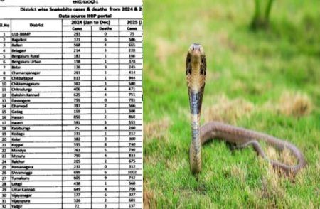 KARNATAKA SHOCKING : ರಾಜ್ಯದಲ್ಲಿ 3 ವರ್ಷದಲ್ಲಿ 36,636 ಹಾವು ಕಡಿತ ಕೇಸ್ ದಾಖಲು : 273 ಮಂದಿ ಬಲಿ!By kannadanewsnow5727/03/2026 9:55 AM KARNATAKA 2 Mins Read ಬೆಂಗಳೂರು: ಕರ್ನಾಟಕದಲ್ಲಿ ಕಳೆದ ಮೂರು ವರ್ಷಗಳಲ್ಲಿ ಹಾವು ಕಡಿತದ ಪ್ರಕರಣಗಳು ಆತಂಕಕಾರಿಯಾಗಿ ಏರಿಕೆಯಾಗಿದ್ದು, ಒಟ್ಟು 36,636 ಪ್ರಕರಣಗಳು ವರದಿಯಾಗಿವೆ. ಈ ಪೈಕಿ 273 ಮಂದಿ ಪ್ರಾಣ ಕಳೆದುಕೊಂಡಿದ್ದಾರೆ…