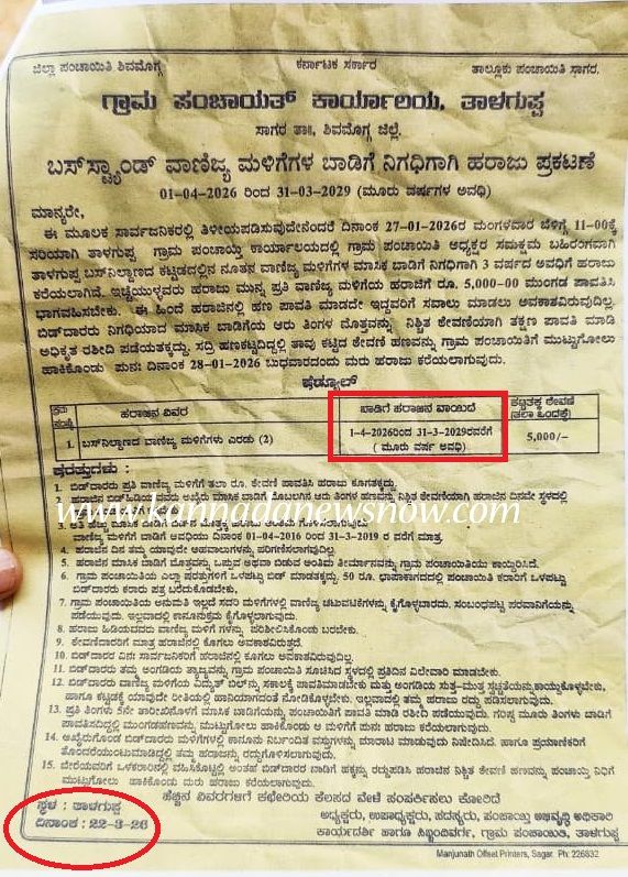 ಇನ್ನೂ ದಿನಾಂಕ 22-03-2026 ಬಾರದೇ ಇದ್ದರೂ ಆ ದಿನಾಂಕದಲ್ಲಿ ಪ್ರಕಟಿಸಿದಂತ ಪಾಪ್ಲೆಟ್ಸ್ ನಲ್ಲಿ ತಾಳಗುಪ್ಪದ ಬಸ್ ನಿಲ್ದಾಣದ ವಾಣಿಜ್ಯ ಮಳಿಗೆಗಳ ಎರಡು ಅಂಗಡಿಗಳ ಟೆಂಡರ್ ಗೆ ಕರೆಯಲಾಗಿದೆ. ಈ ಮಳಿಗೆಗೆಗಳನ್ನು ಈ ಹಿಂದೆ ಟೆಂಡರ್ ಹಿಡಿದು ವಾಣಿಜ್ಯ ಮಳಿಗೆಯನ್ನು ಪಡೆದಿರೋರ ಅವಧಿ ಮಾತ್ರ ದಿನಾಂಕ 01-04-2026ಕ್ಕೆ ಮುಕ್ತಾಯವಾಗಲಿದೆ.