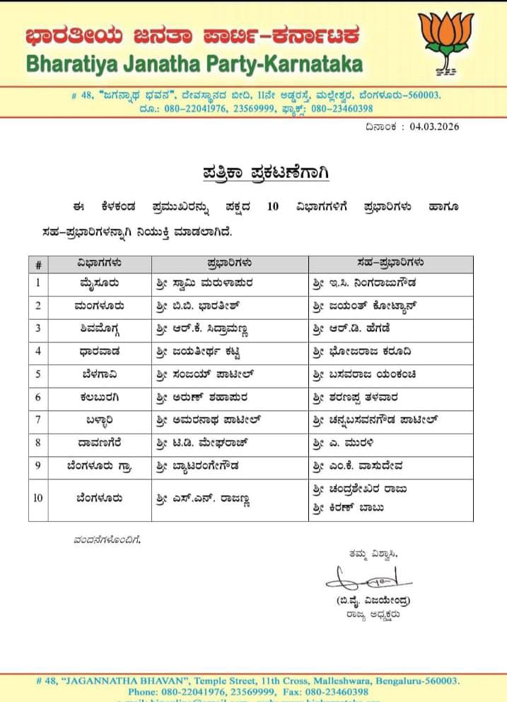 ರಾಜ್ಯದ 10 ವಿಭಾಗಗಳಿಗೆ ಬಿಜೆಪಿಯಿಂದ ಪ್ರಭಾರಿ, ಸಹ-ಪ್ರಭಾರಿಗಳನ್ನು ನಿಯುಕ್ತಿಗೊಳಿಸಿ ಬಿವೈ ವಿಜಯೇಂದ್ರ ಆದೇಶ